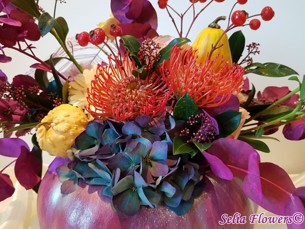 Compozitie: Este decorat cu flori de bumbac, eucalypt vopsit, ruscus stabilizat, hydrangea, trandafiri, leucospermum, germinis, crizanteme, skimmia, macese, crengute de eucalypt vopsit.