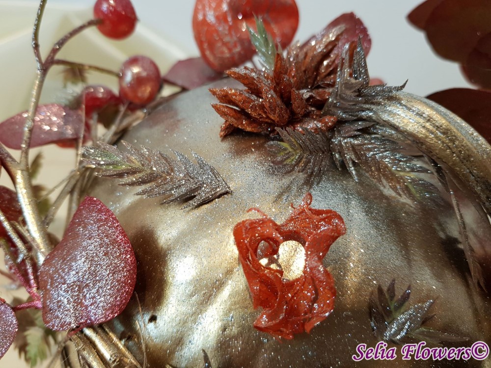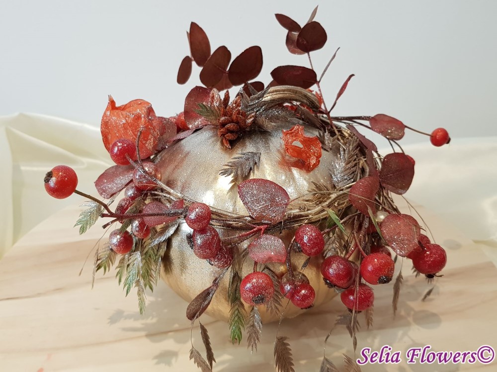 Un dovleac mic si delicat, acoperit cu o mantie aurie, invaluit in stelute colorate si premiat cu o coronita construita din fructe de maces si crengute de eucalypt.