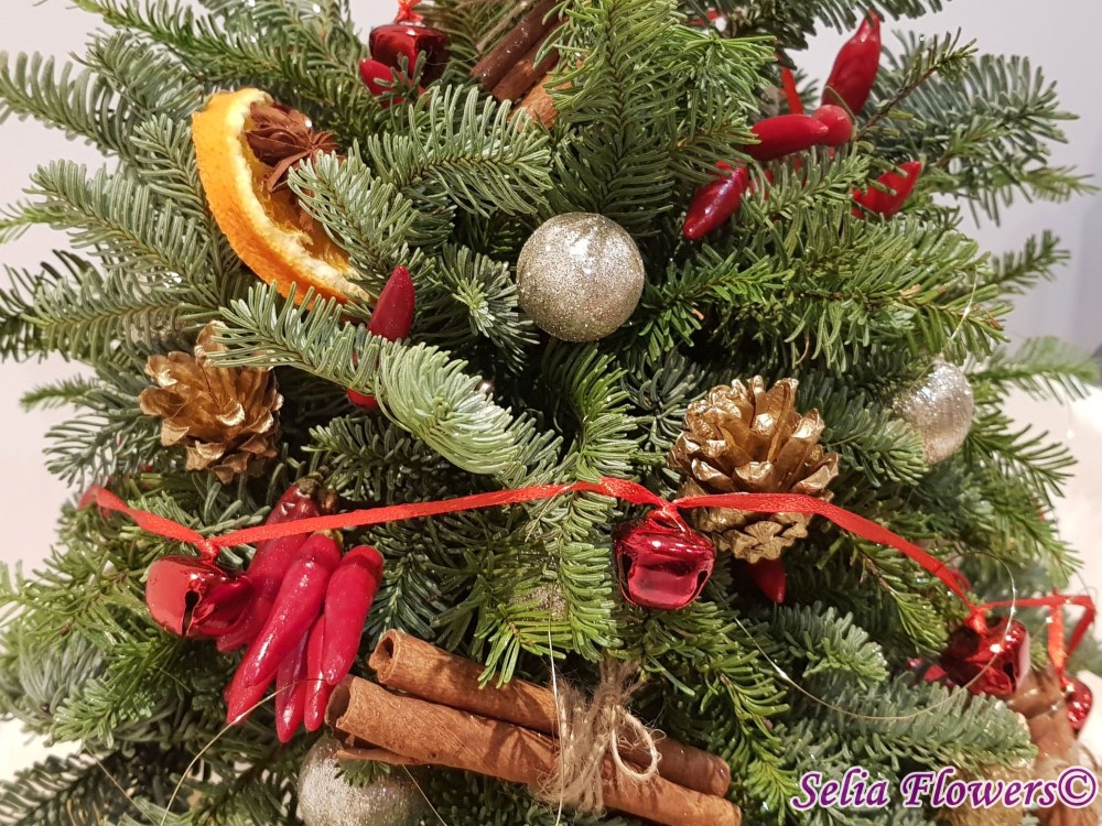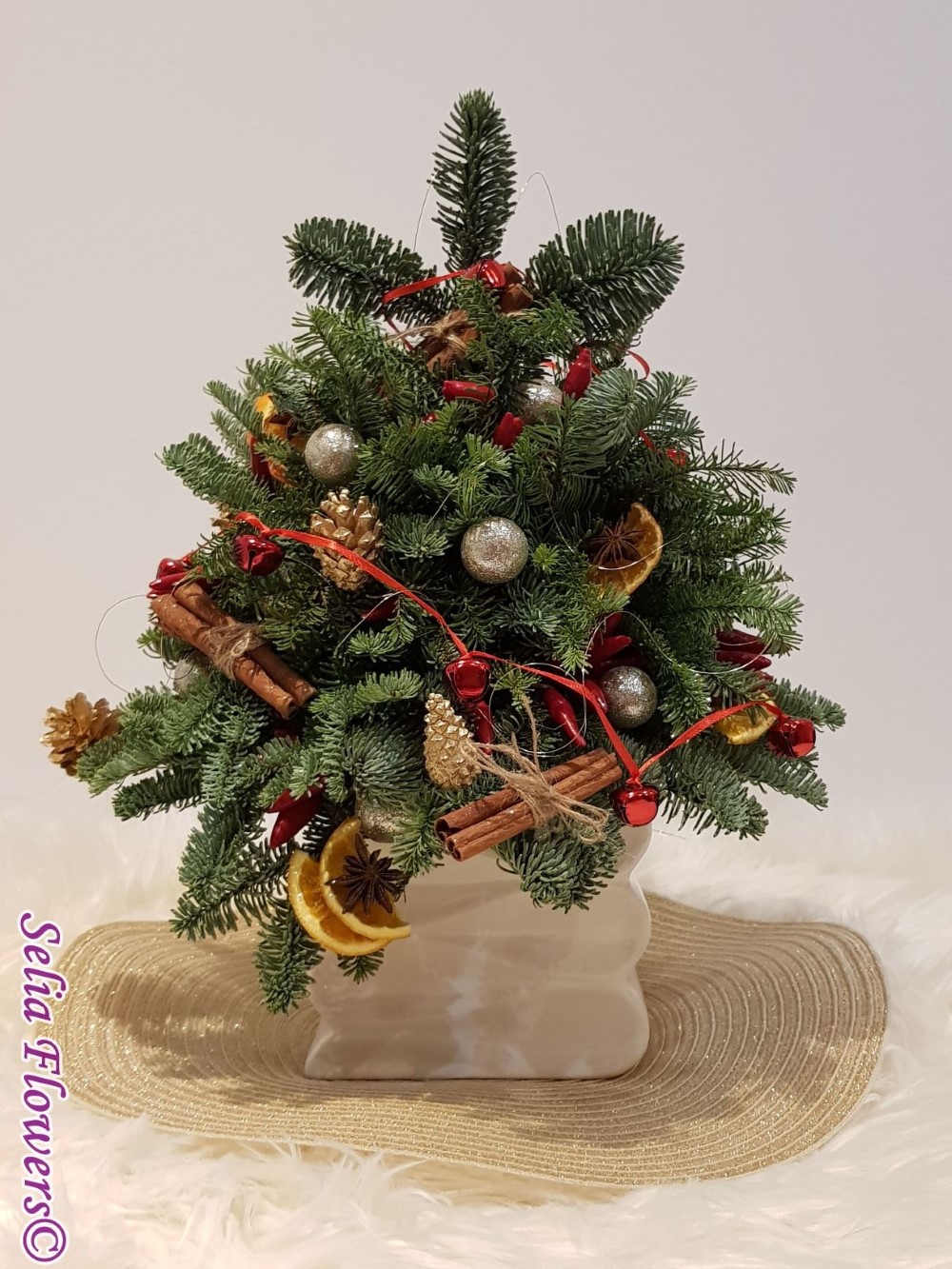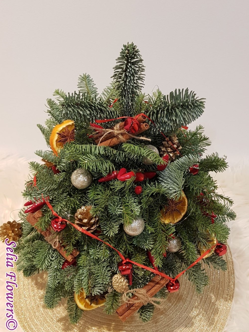 Bradut construit pe suport de burete floral umed, din brad natural argintiu si ardei rosu decorativ. Este accesorizat cu scortisoara, anason si felii deshidratate de portocala, globulete si ghirlanda cu clopotei. Inaltimea aranjamentului este de 45 cm.