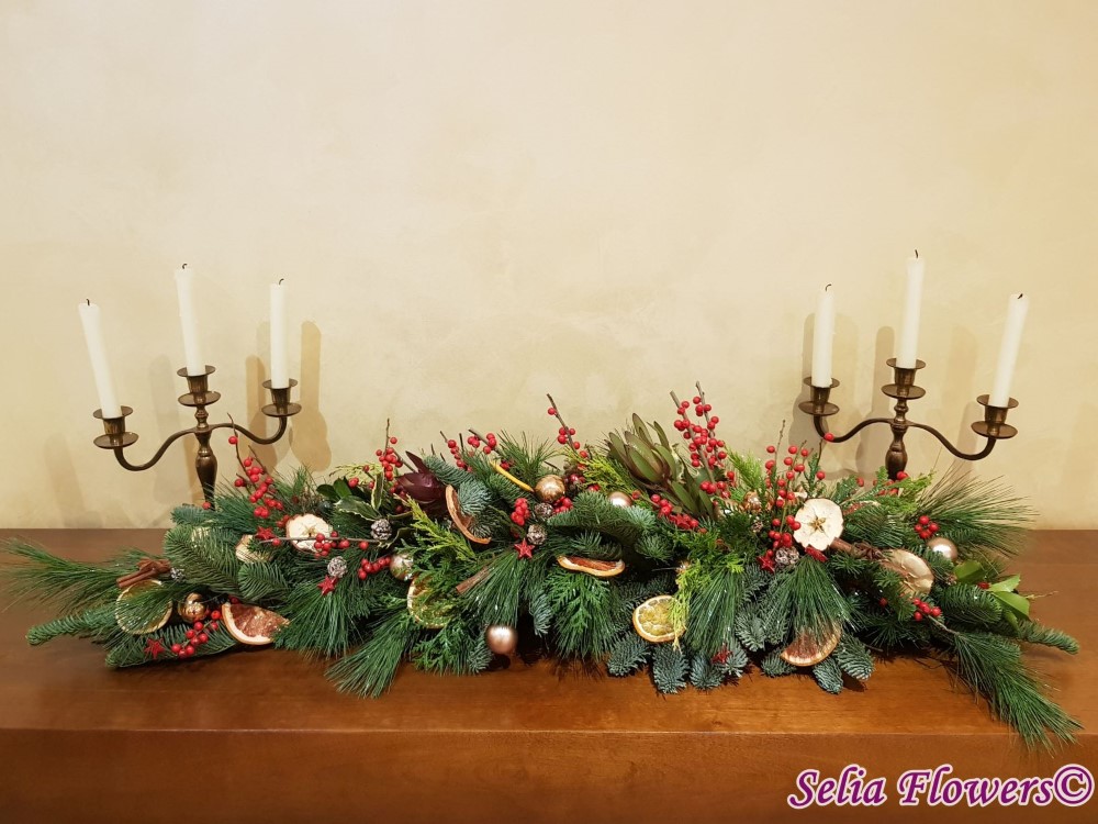 Este foarte potrivit ca decor pentru masa festiva de Craciun sau comoda din livingul tau. Lungimea aranjamentului este de aproximativ un metru .