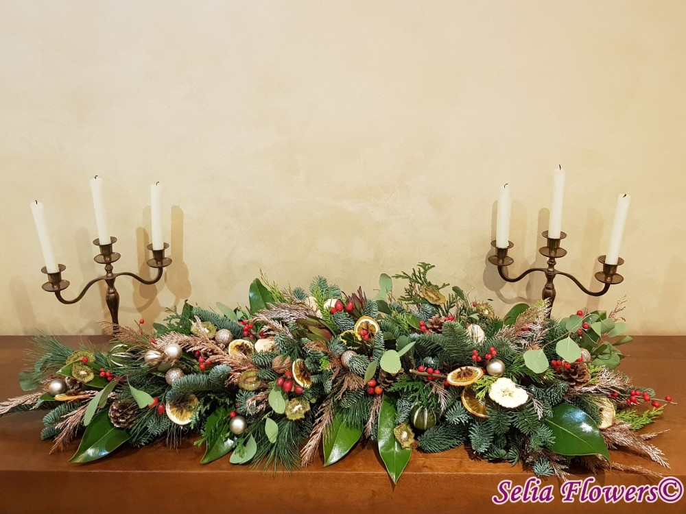 Este foarte potrivit ca decor pentru masa festiva de Craciun sau comoda din livingul tau. Lungimea aranjamentului este de aproximativ un metru .