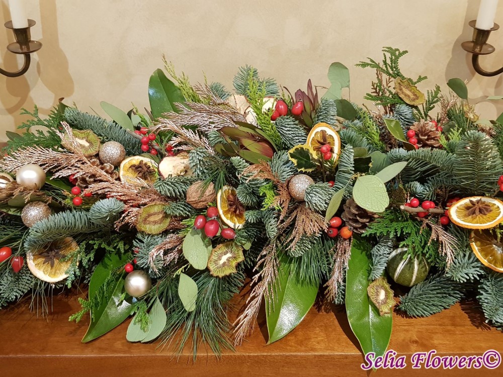 Aranjament tip ghirlanda, construit din mix de conifere, frunze de magnolie, eucalipt, ilex, anason, leucadendron, conuri de brad, globulete si mix de fructe deshidratate - lime, mar si portocala.