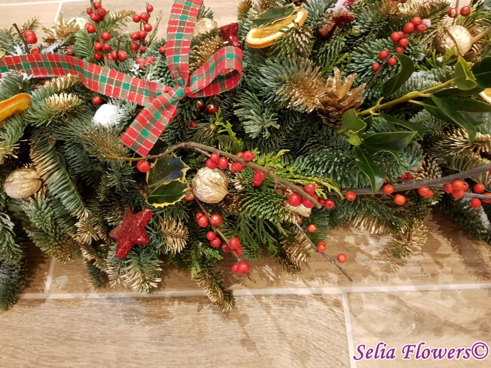 Aranjament construit sub forma unei ghirlande din brad argintiu natural, tuia, ilex, conuri de brad, nuci, portocale deshidratate si alte decoratiuni de sezon.