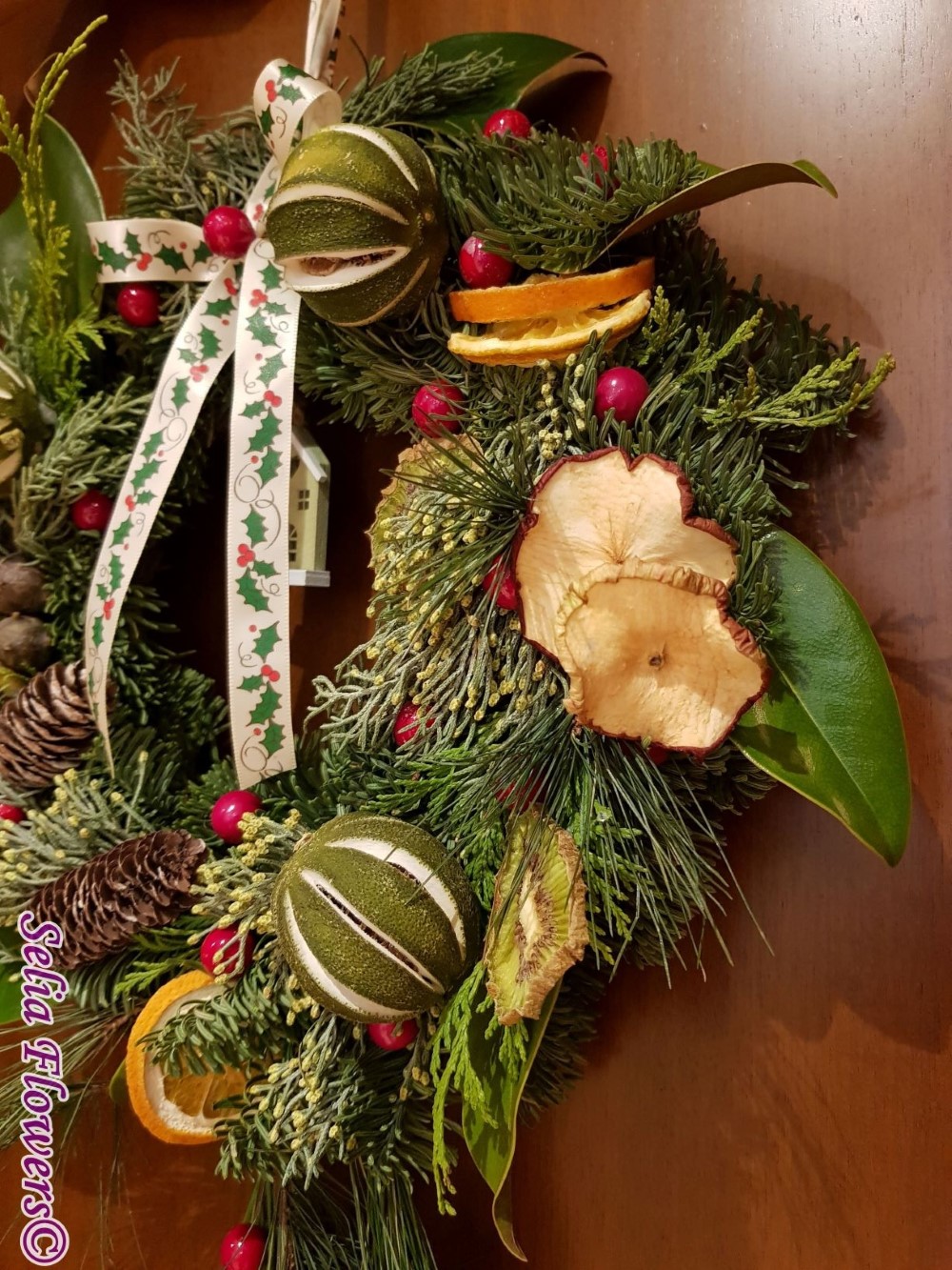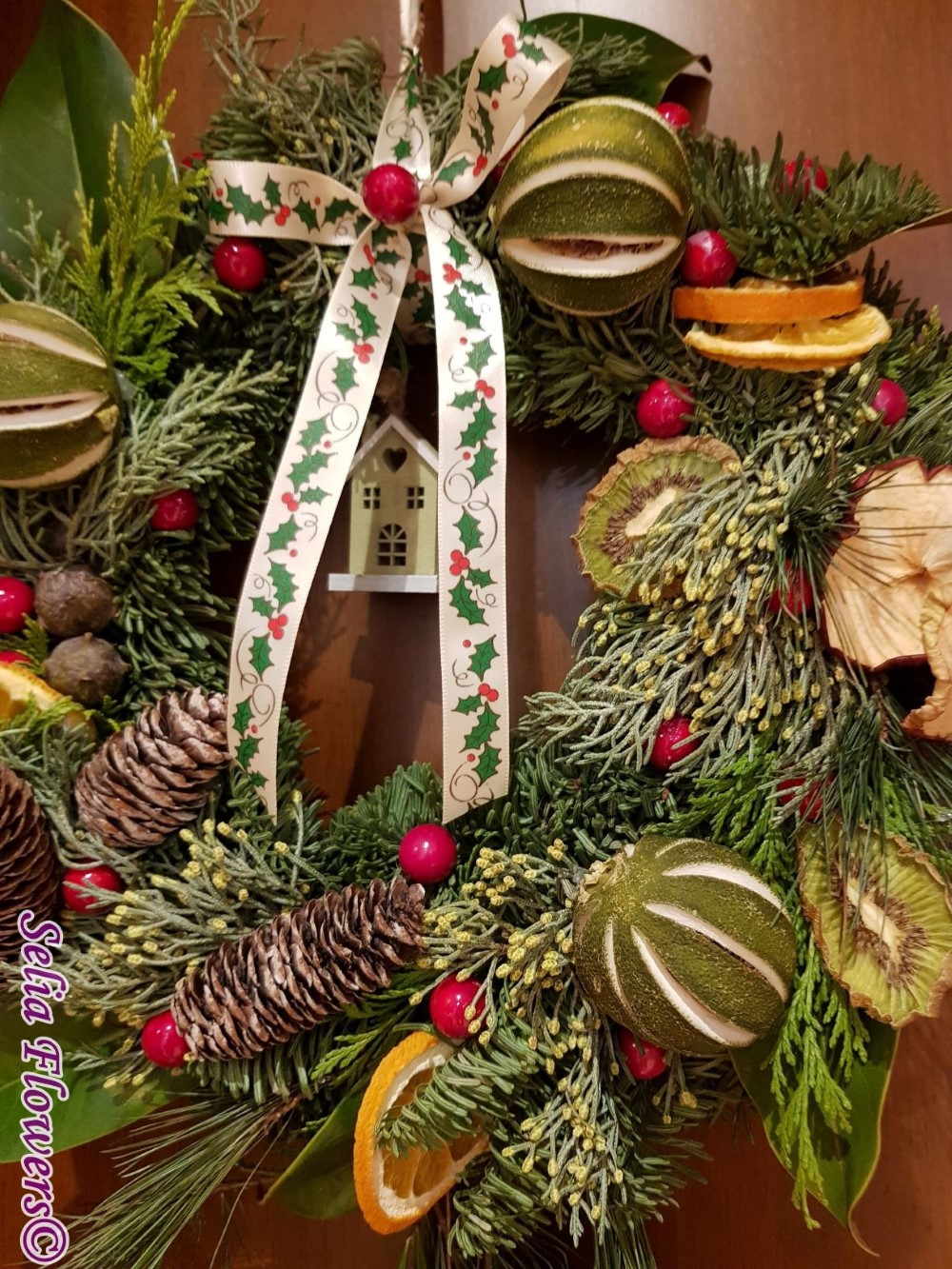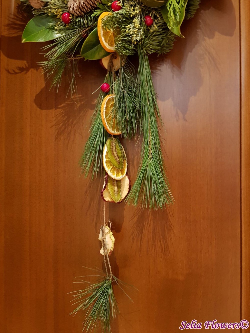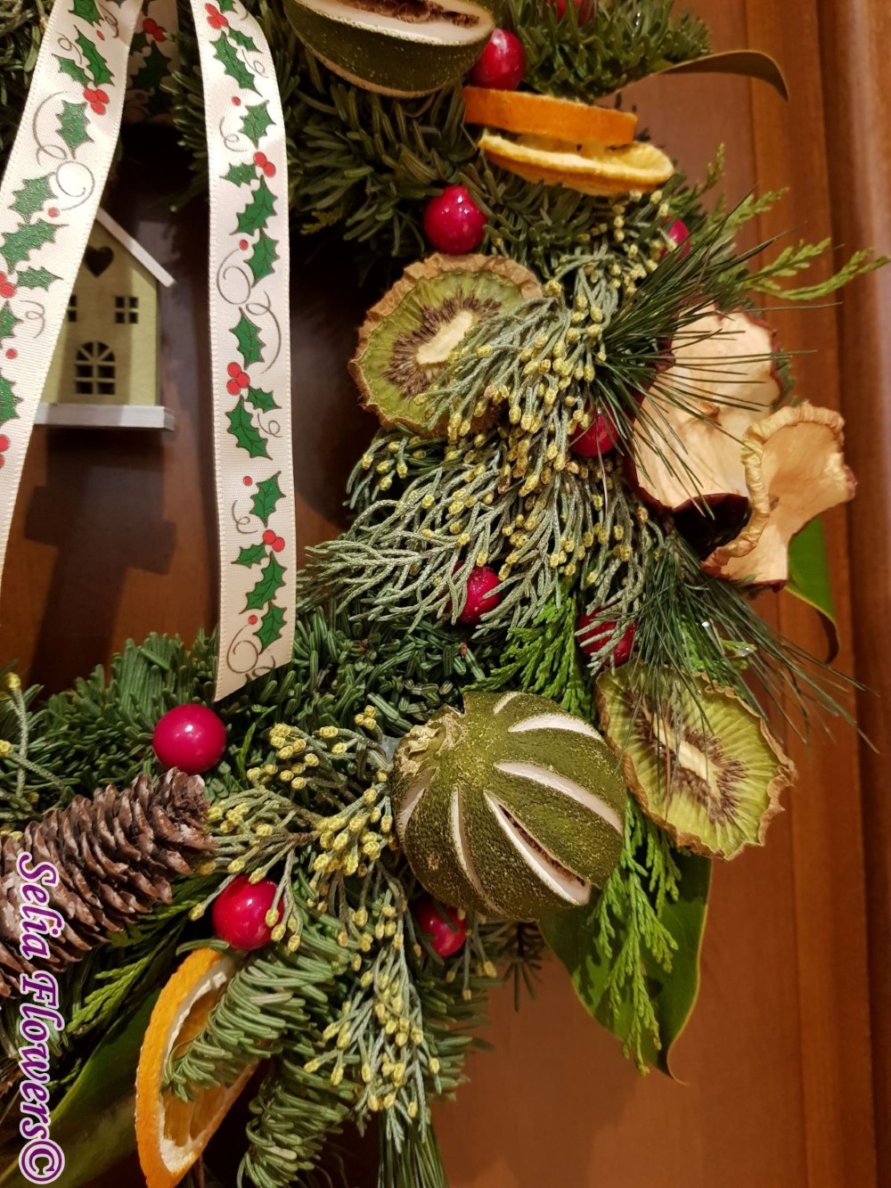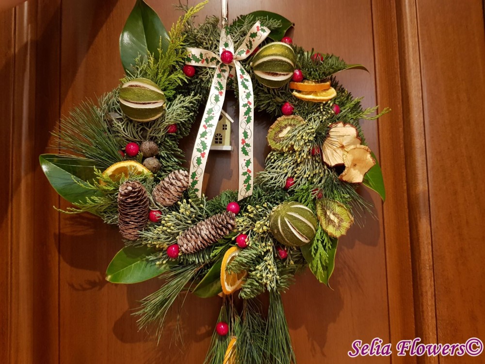Coronita construita din mix de conifere, fructe deshidratate, conuri de brad, scortisoara, anason si alte elemente de decor. La baza este prevazuta cu doua ghirlande din fructe deshidratate.