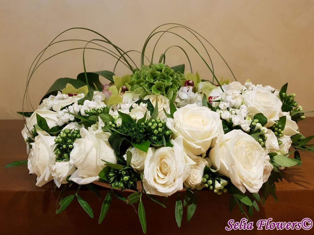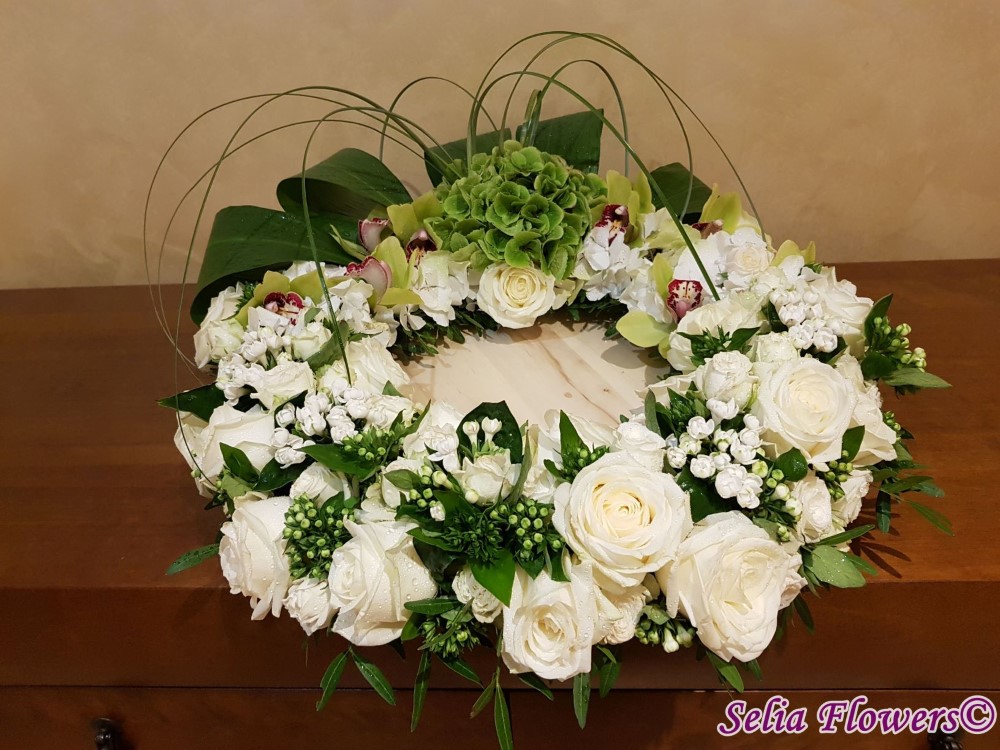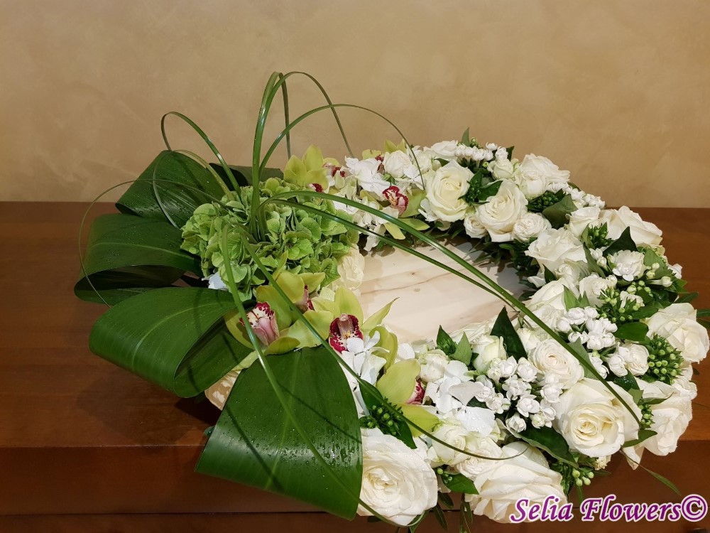 Coroana funerara moderna, cu design elegant, realizata cu trandafiri si minirose albe, hydrangea in doua culori, orhidee cymbidium in doua culori, bouvardia, aspidistra, beargrass, pistache.