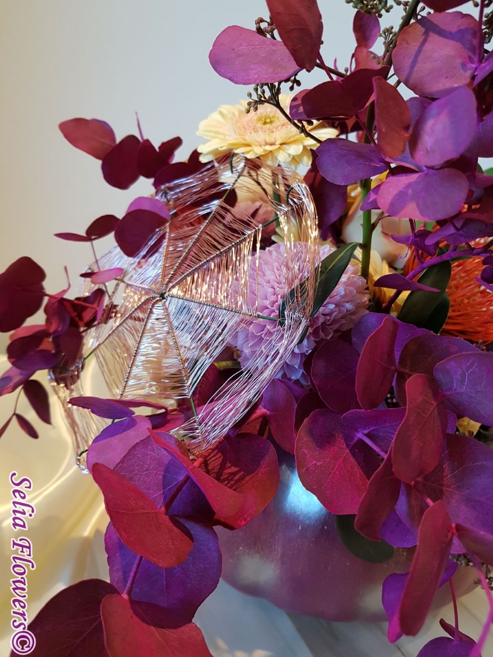 Compozitie: Este decorat cu flori de bumbac, eucalypt vopsit, ruscus stabilizat, hydrangea, trandafiri, leucospermum, germinis, crizanteme, skimmia, macese, crengute de eucalypt vopsit.