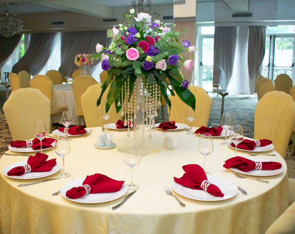 Aranjament centerpiece cu trandafiri, lisianthus, germini, eucalipt, aspidistra