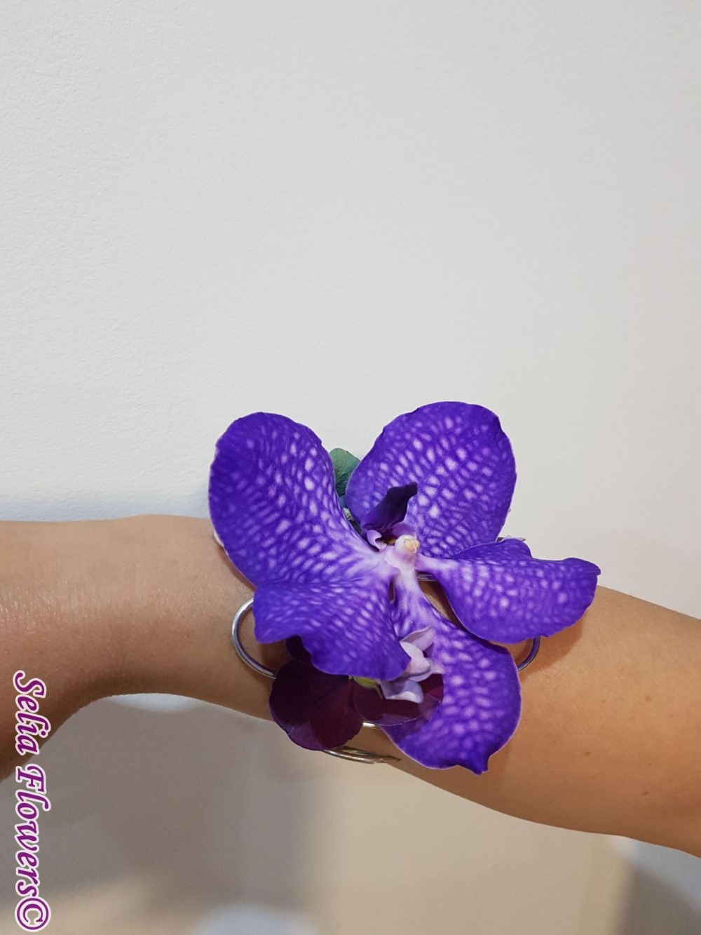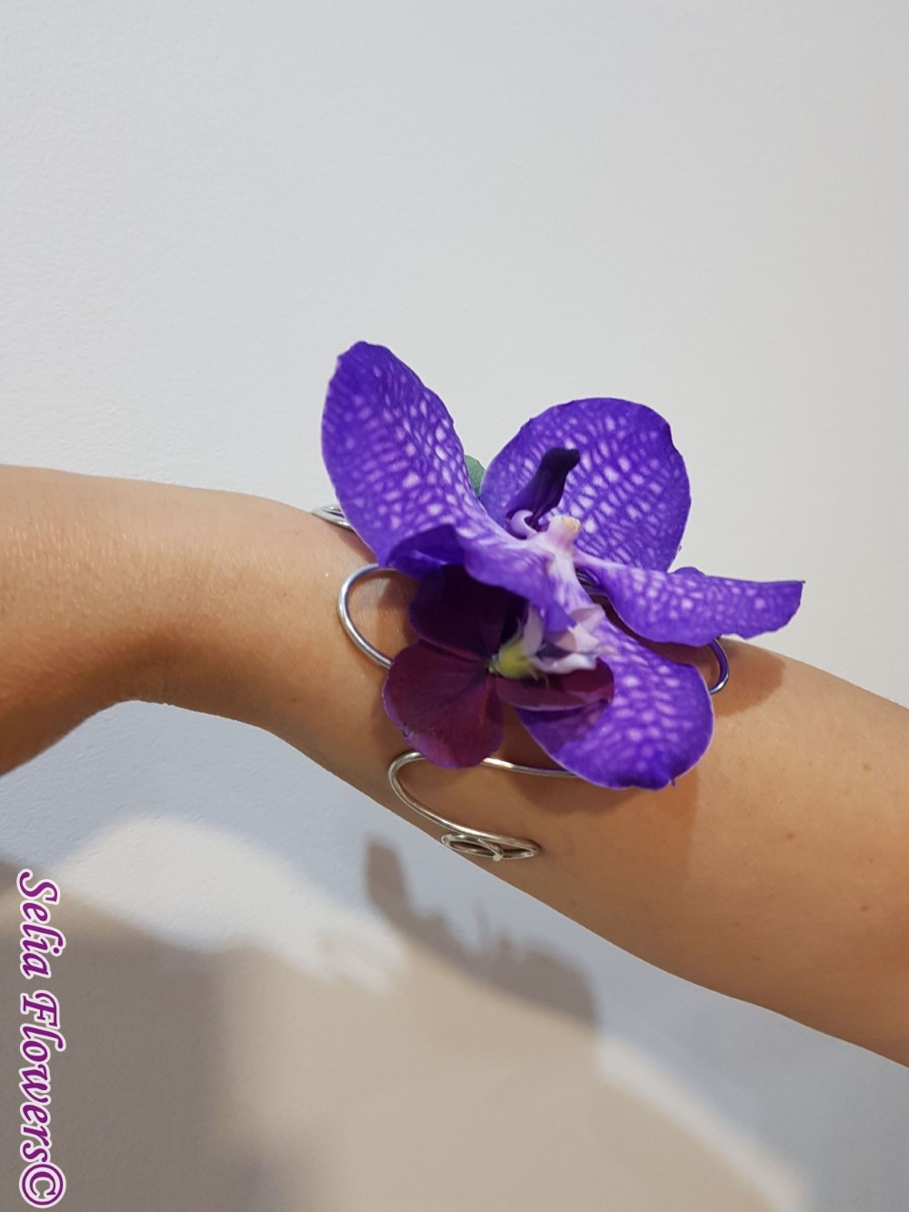 Bratara este construita cu orhidee vanda, hydrangea si oxypetalum, pe o baza din sarma decorativa din aluminiu.