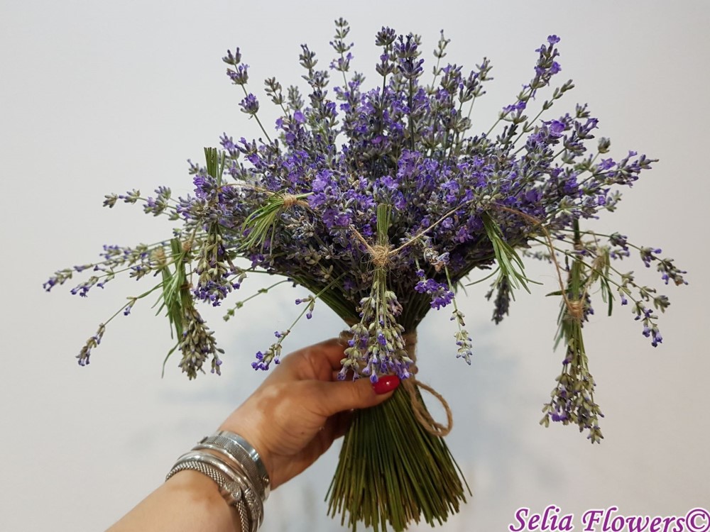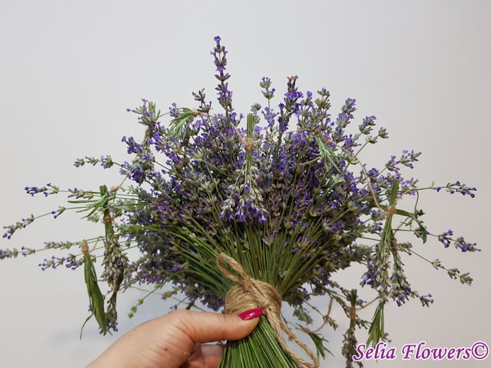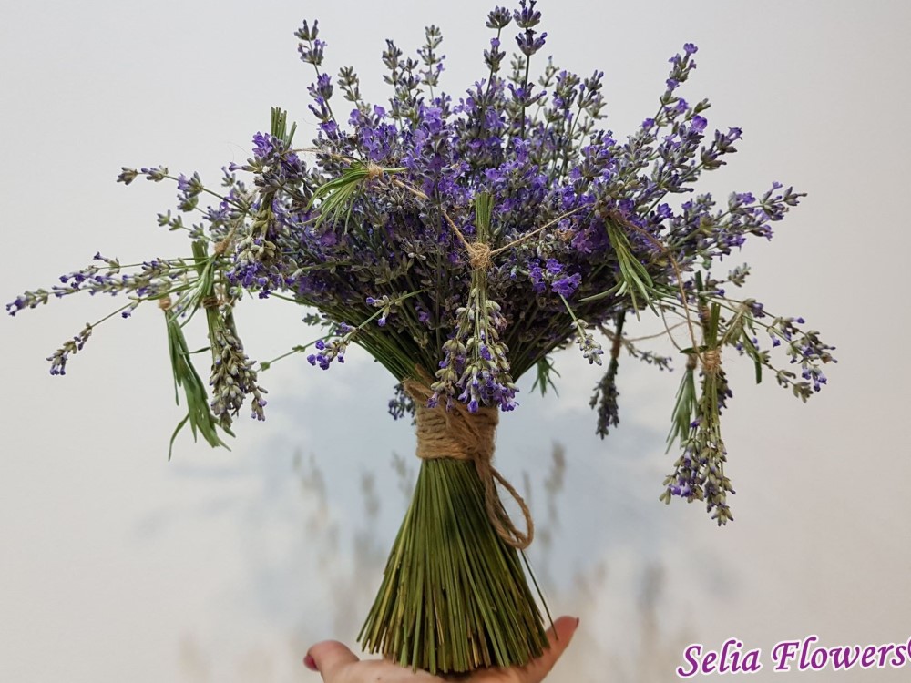 Simplu, dar elegant, un buchet construit pe structura, din flori de lavanda, floarea ideala pentru nunti rustice, organizate in aer liber. Are un parfum natural de neegalat si este accesorizat cu ghirlanda din buchetele de lavanda.