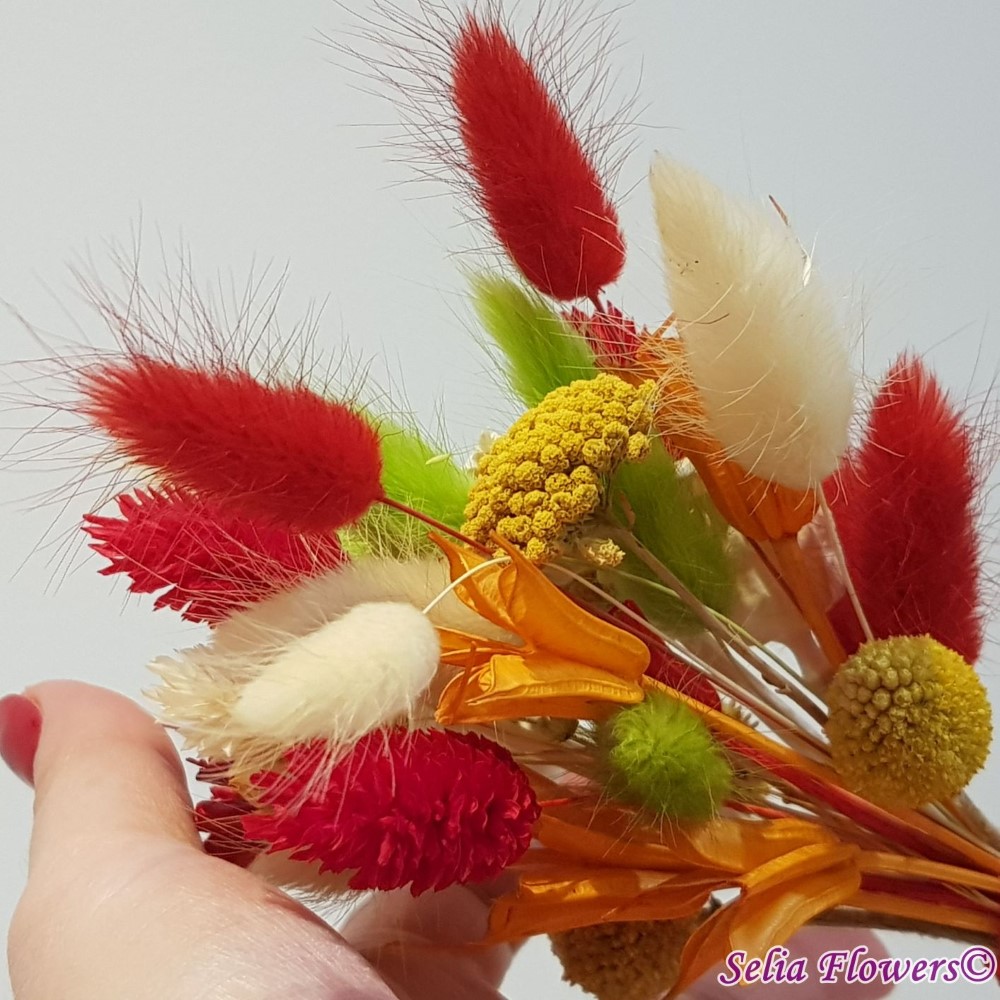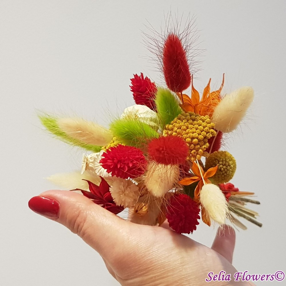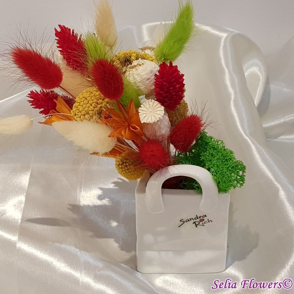 Alege sa daruiesti un martisor unicat, vesel si colorat, sub forma de buchet, construit din flori uscate sau stabilizate. Inaltimea buchetelului este de 17 cm Buchetelul este insotit de o punguta cadou din material ceramic, cu o inaltime de 9,5 cm.