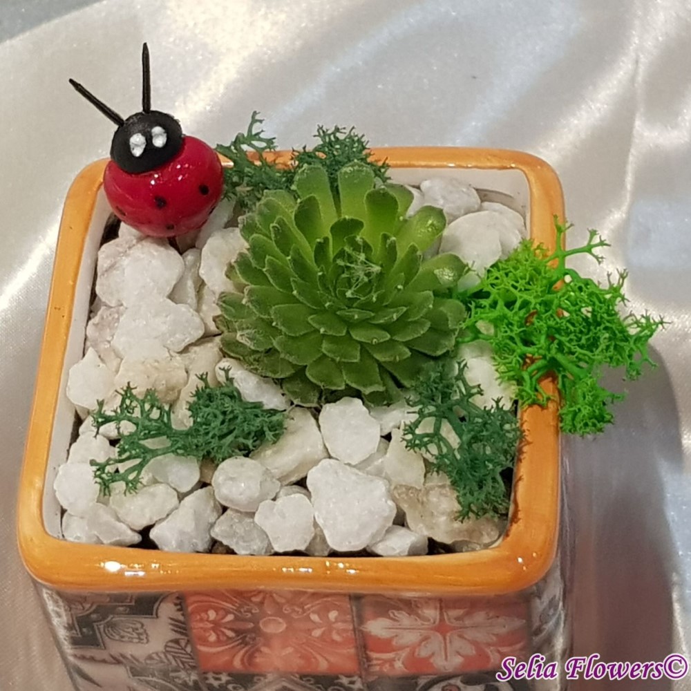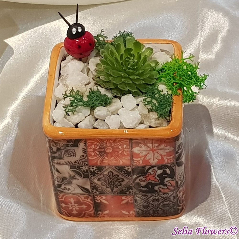 Martisor floral cu suculenta, licheni stabilizati, accesorii, pietricele din marmura decorativa. Este construit in vas ceramic cu model, tip cub (inaltimea vasului 8 cm).