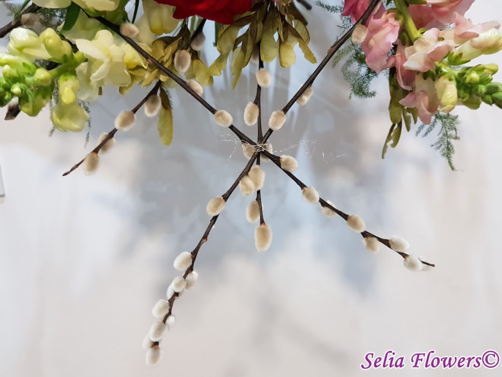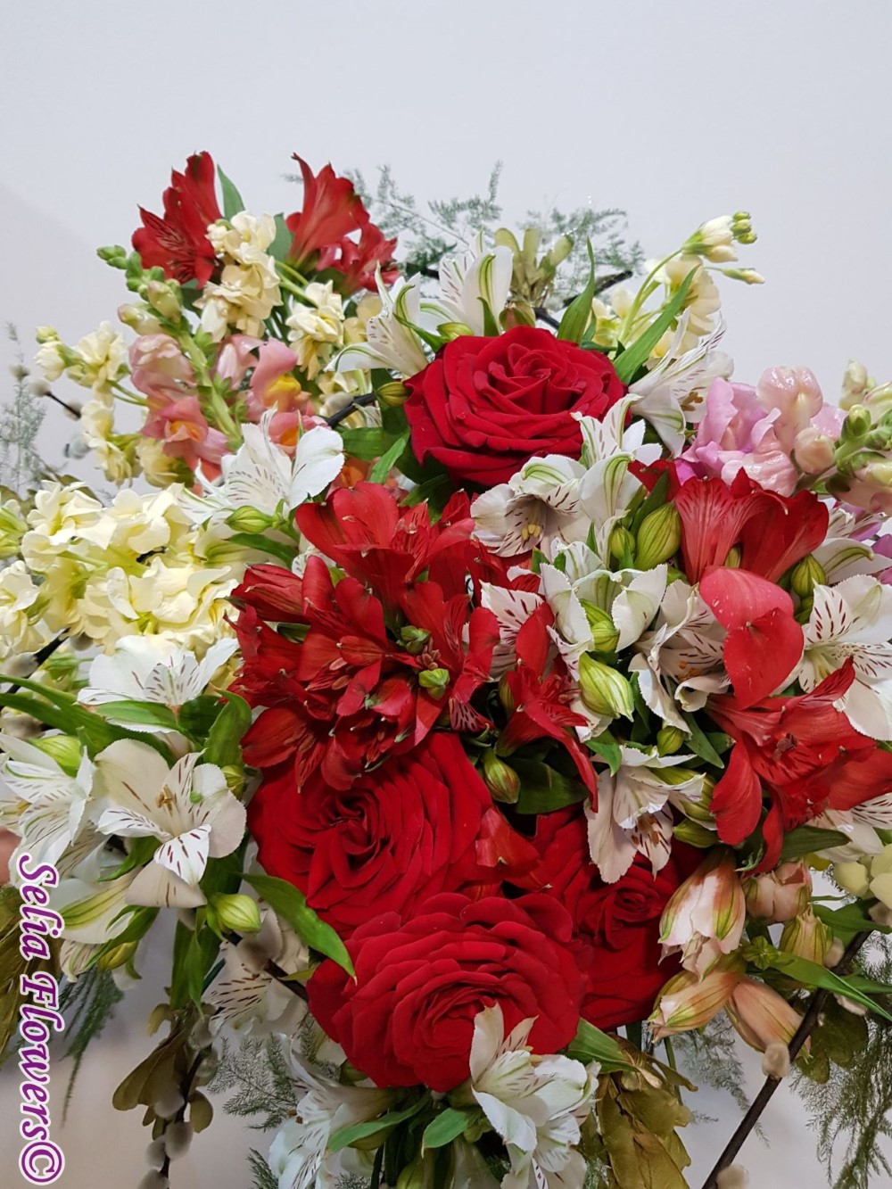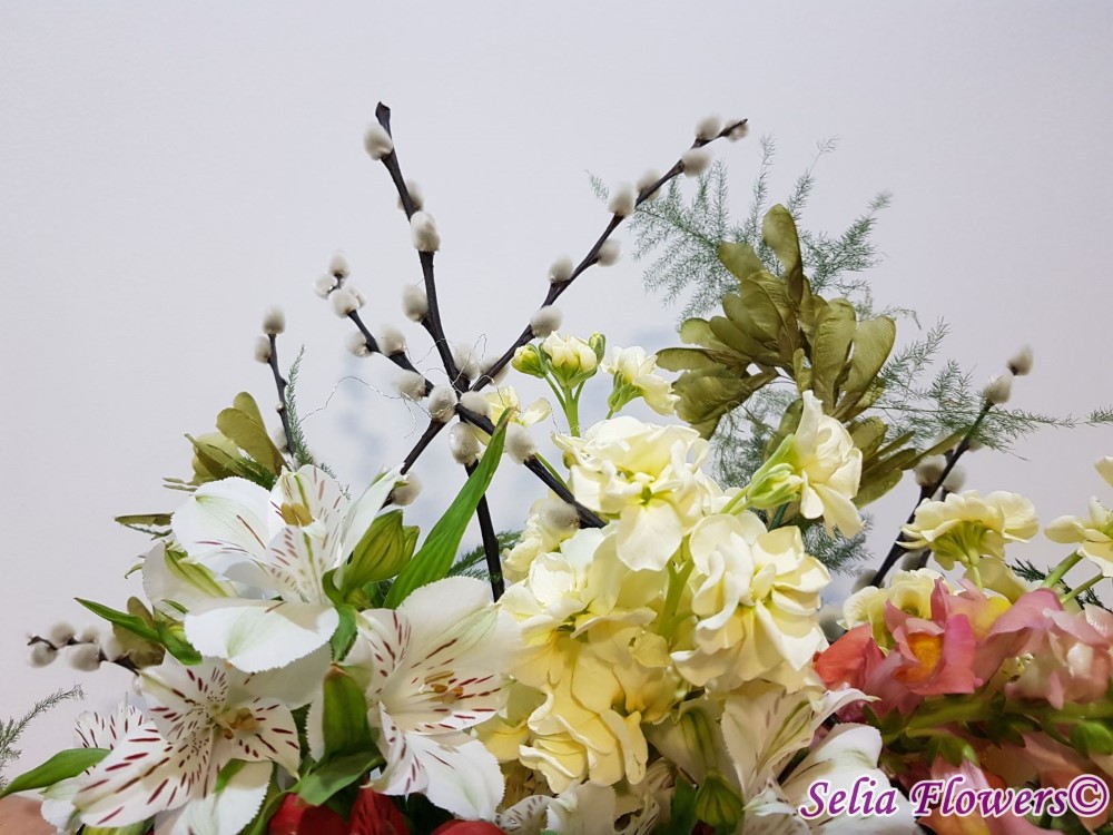 Culoare si parfum intr-un buchet expresiv, construit pe structura de sarma si salix, cu trandafiri, mathiola, alstroemeria, crengute de asparagus.