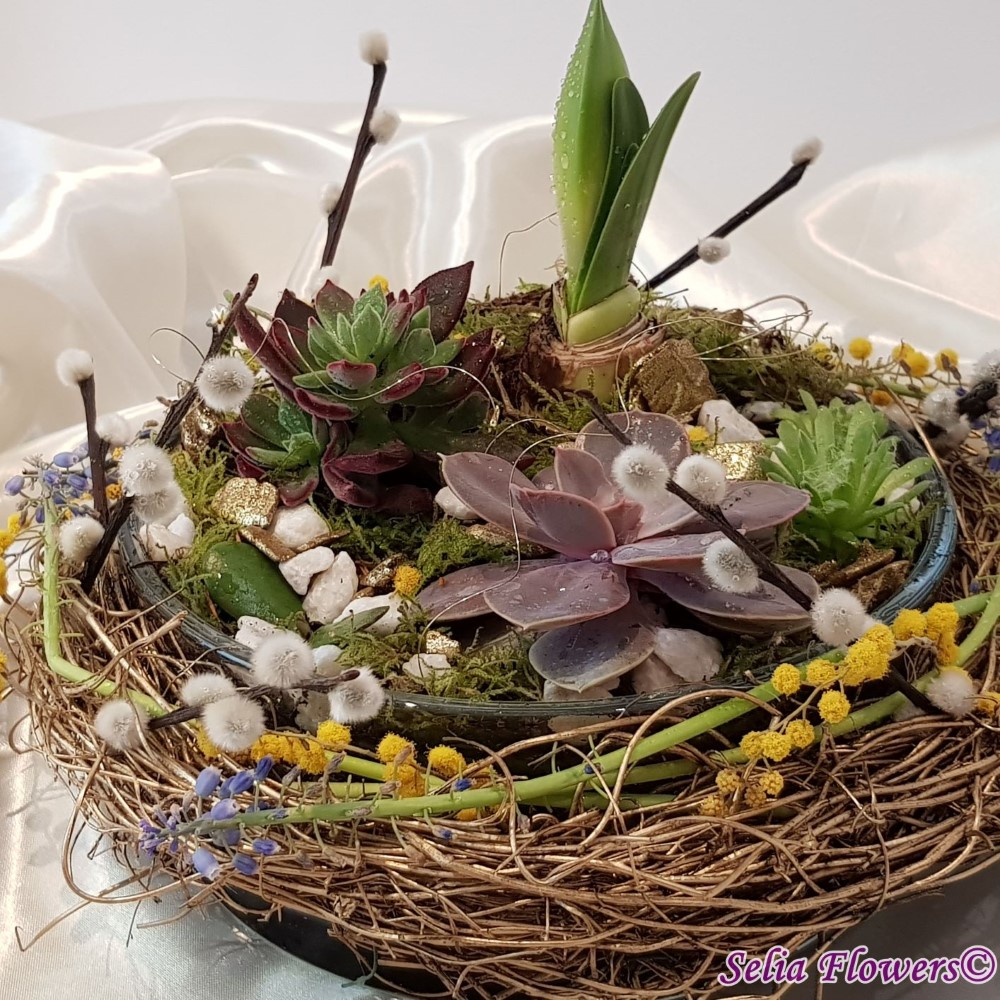 O gradina in miniatura construita in bol rotund din sticla cu plante suculente, amaryllis roz si muschi natural. Aranjamentul este decorat cu pietricele de marmura decorativa si fasii de lemn vopsite. O coronita eleganta, construita din crengute naturale uscate si decorate cu flori uscate de muscari, mimosa si crengute de salix, inconjoara bolul pe toata circumferinta lui.