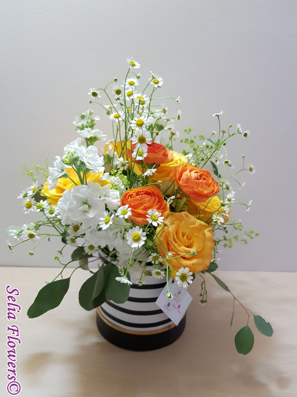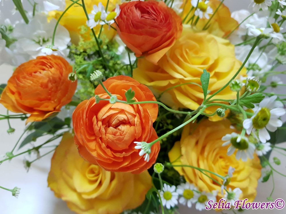 Un aranjament in cutie, vesel ca o primavara, realizat realizat cu trandafiri galbeni, ranunculus, matricaria.