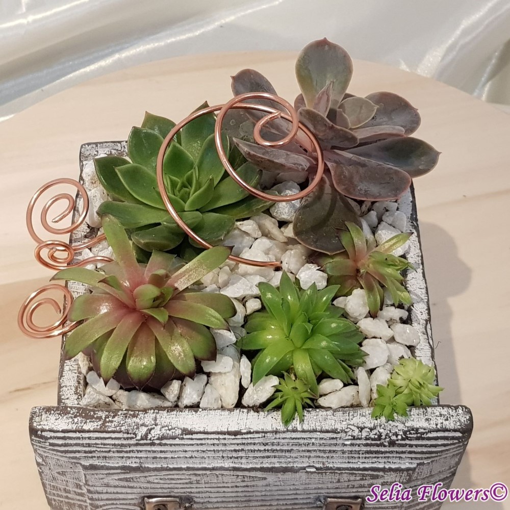 Un aranjament construit in ghiveci ceramic tip sertar, dintr-un mix de plante suculente.