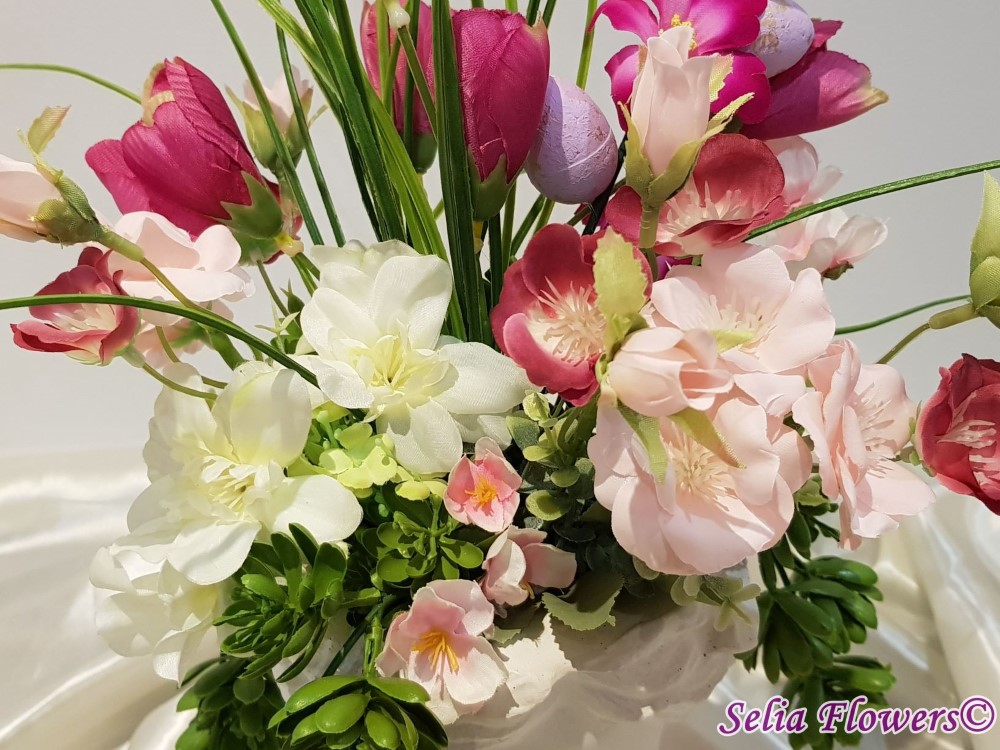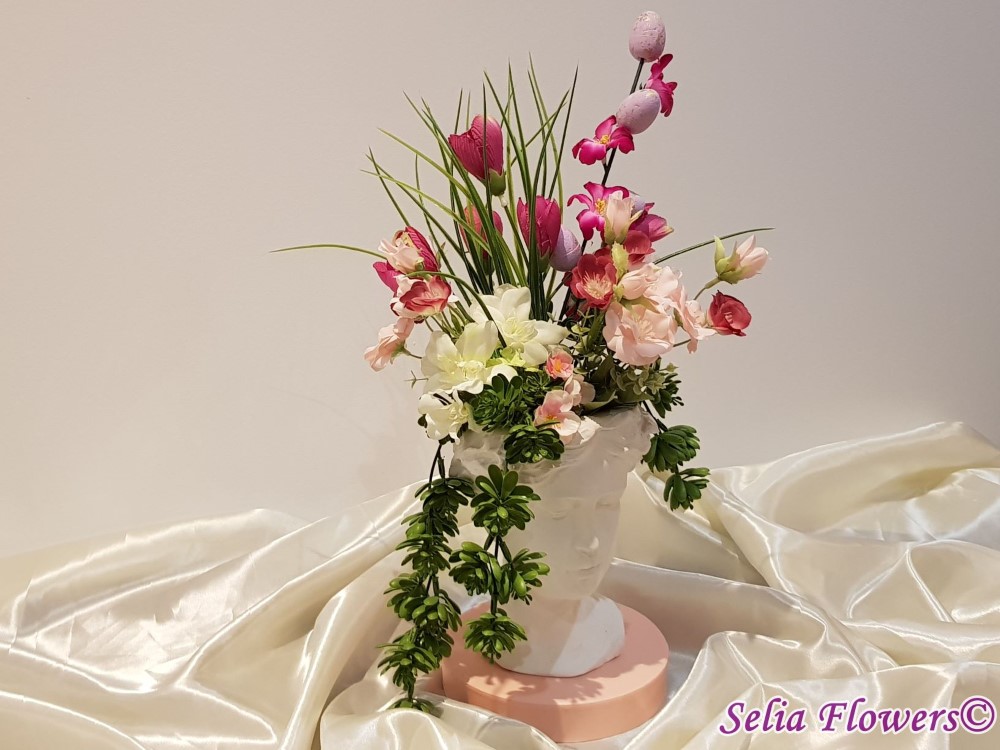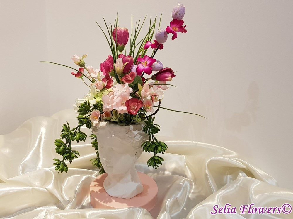 Un aranjament permanent construit în vază Venus cu flori din mătase (iris, narcise, crenguță de cireș), planta artificială real touch și crenguță cu decor pascal.