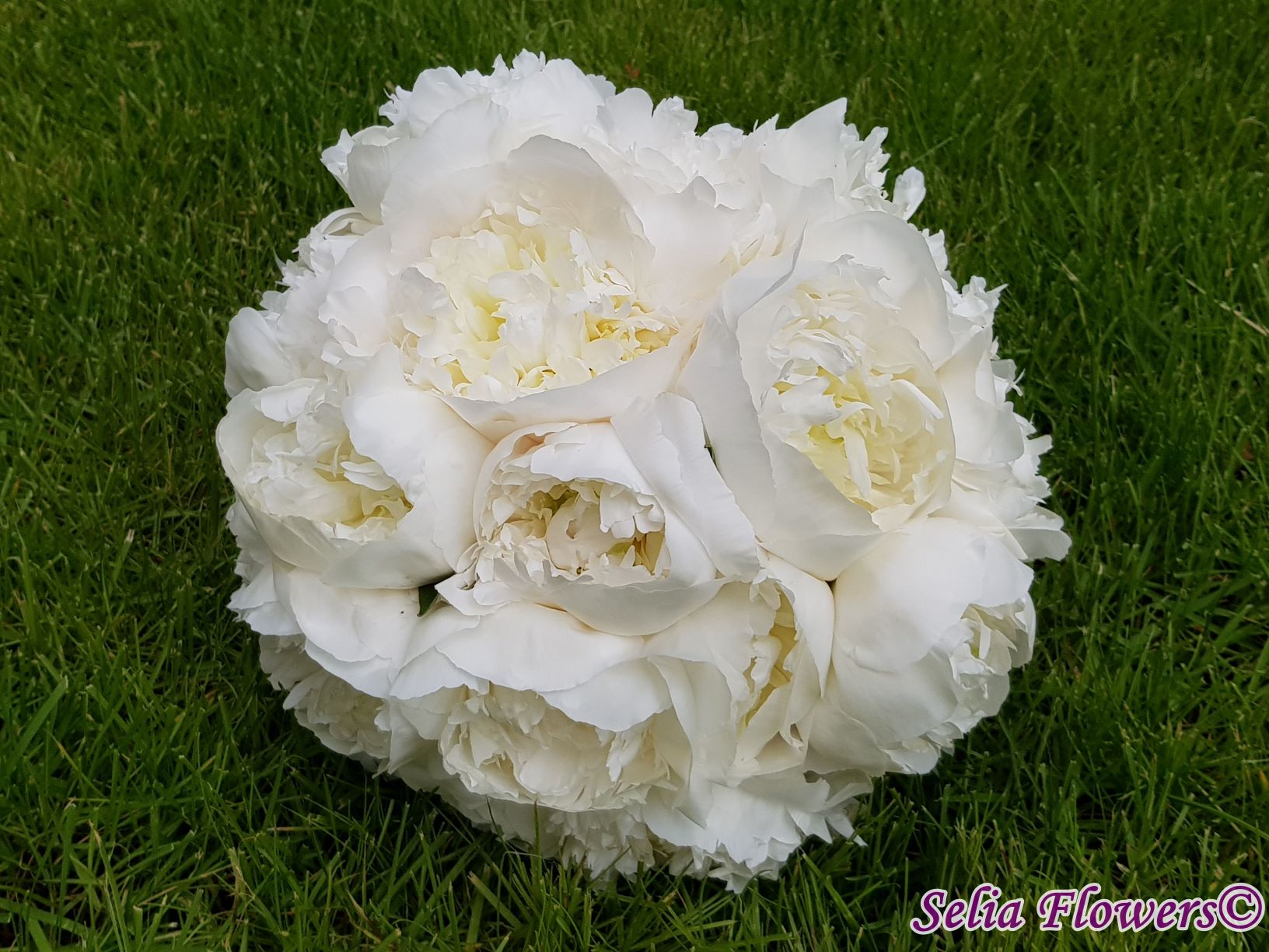 Un buchet pentru o mireasă romantică, construit cu 21 de fire de bujori albi.