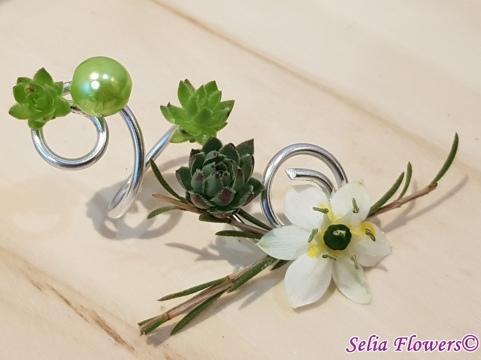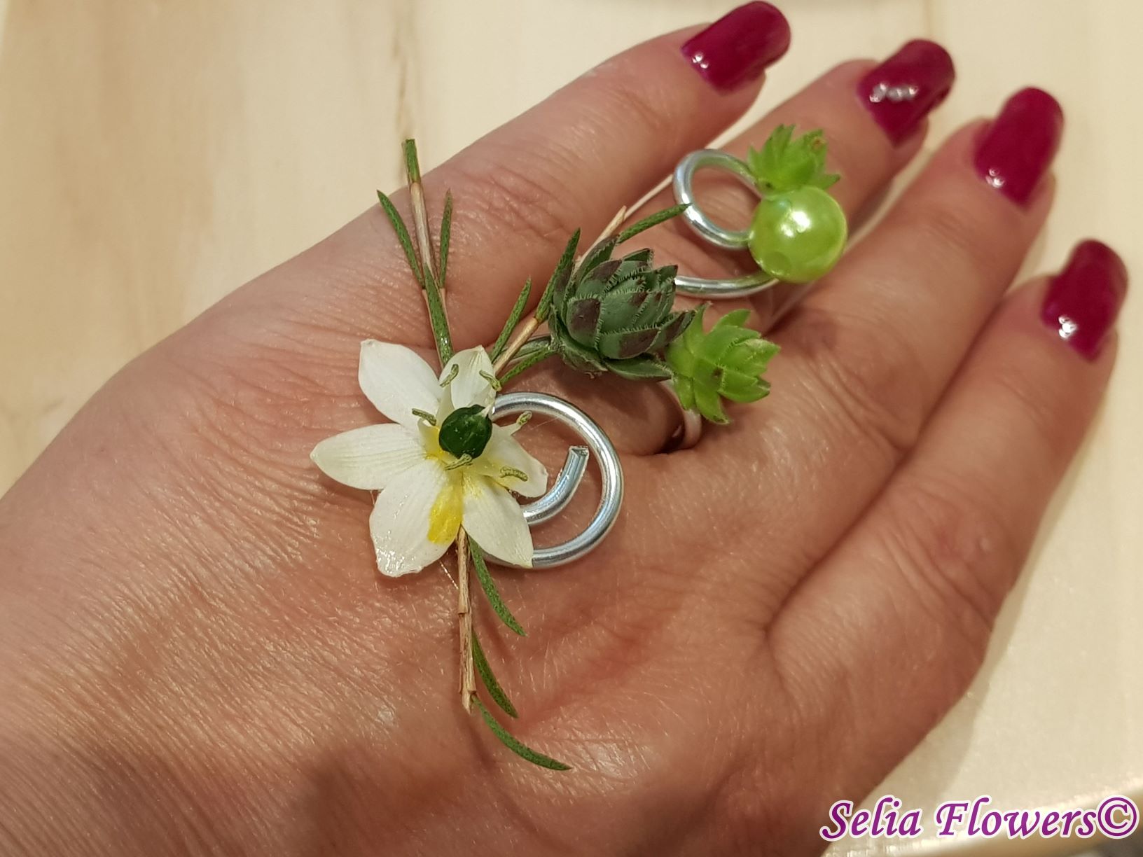 Bijuterie handmade tip inel, lucrata cu sarma floristica decorativa si accesorizata cu flori naturale de ornithogalum, wax flower, plante suculente si perla.