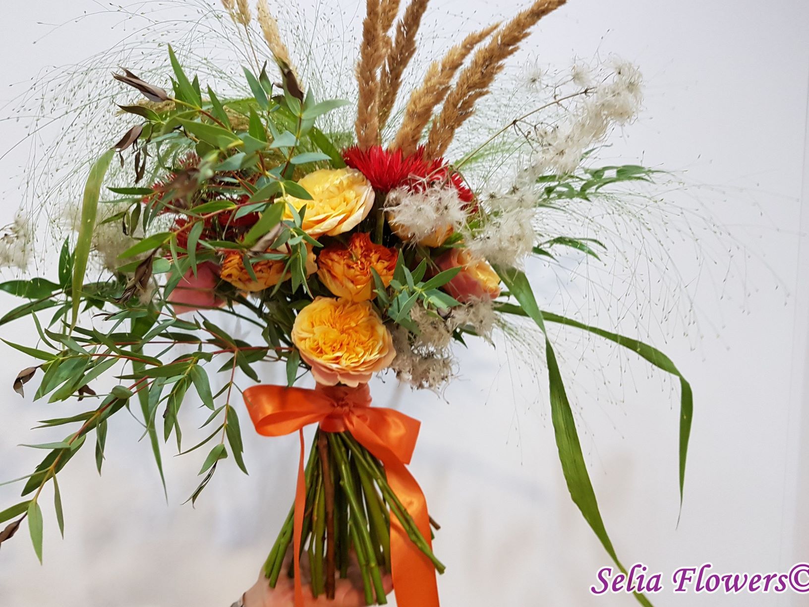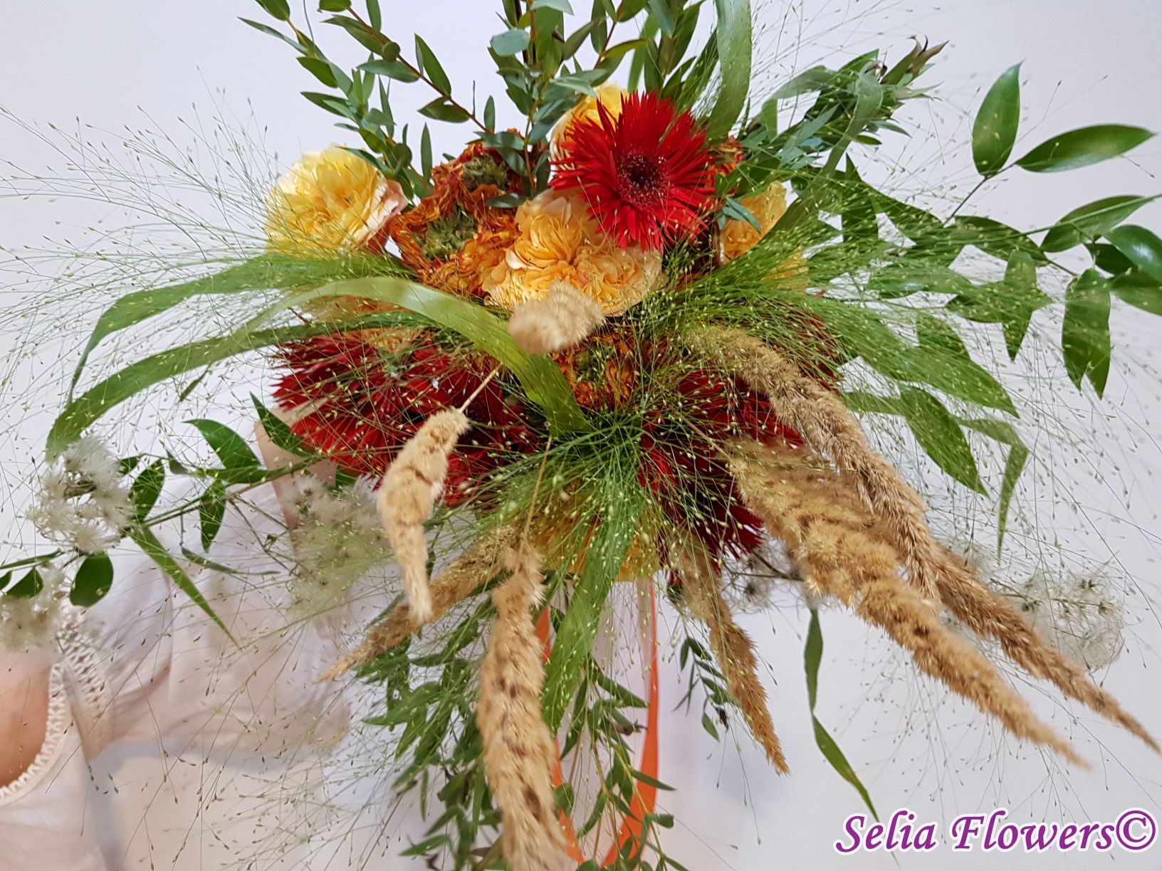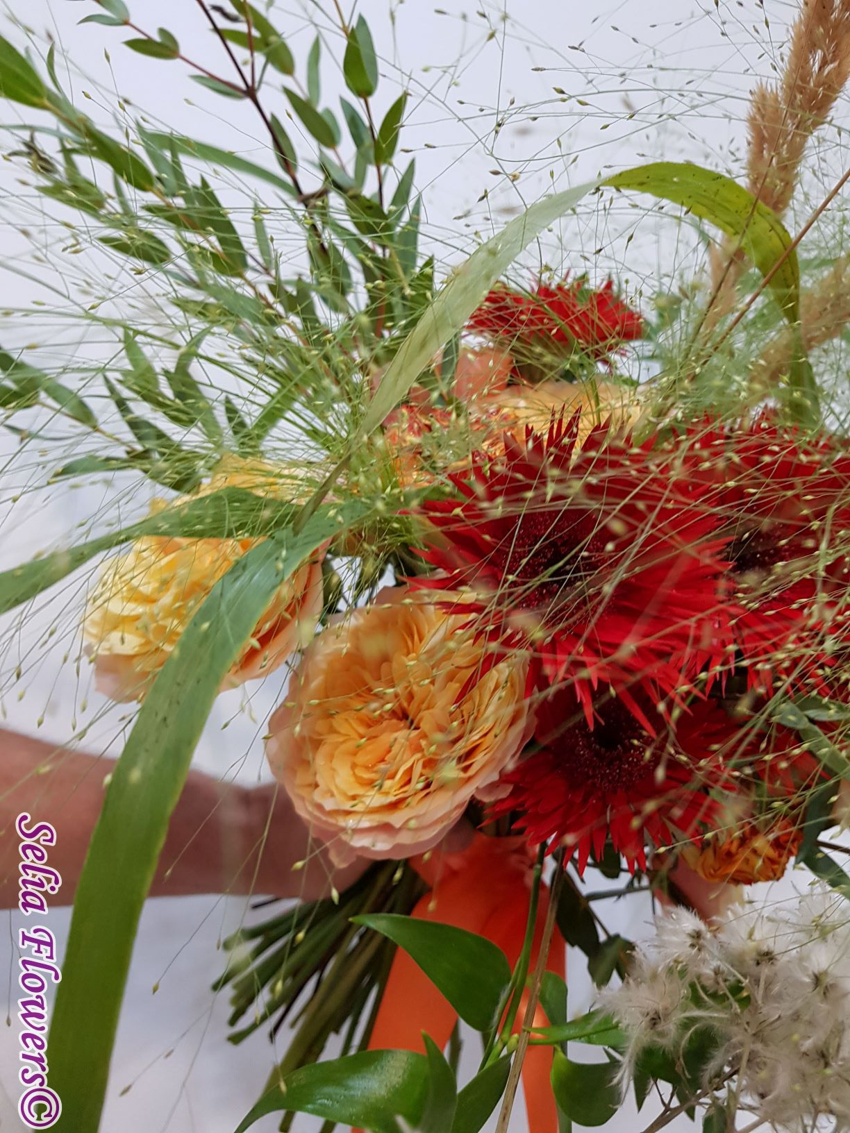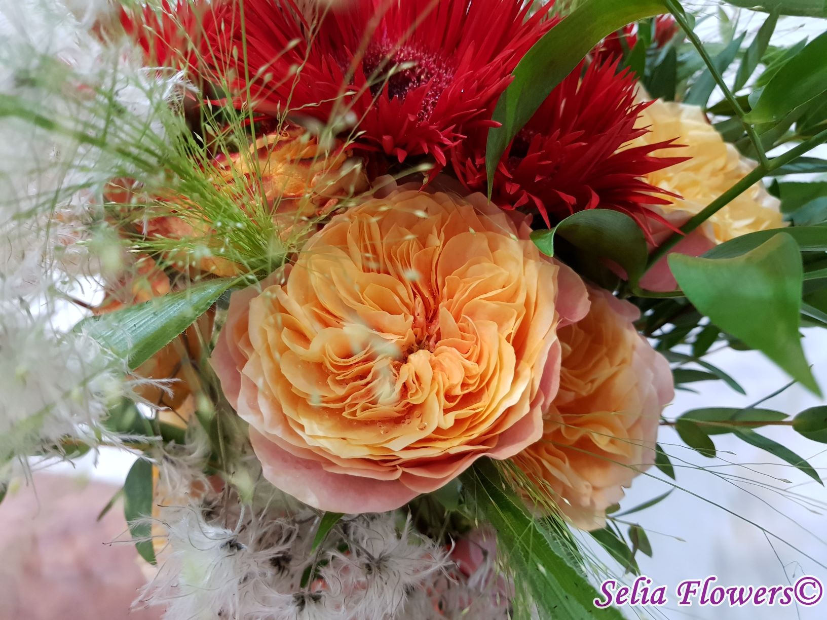 Pentru o persoana draga, un buchet pretios si plin de culoare, construit cu vip roses, clematis salbatic, germini, panicum, material vegetal din flora spontana.