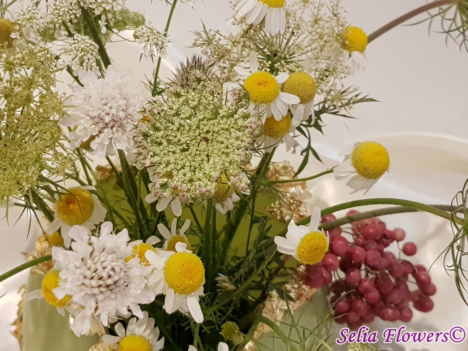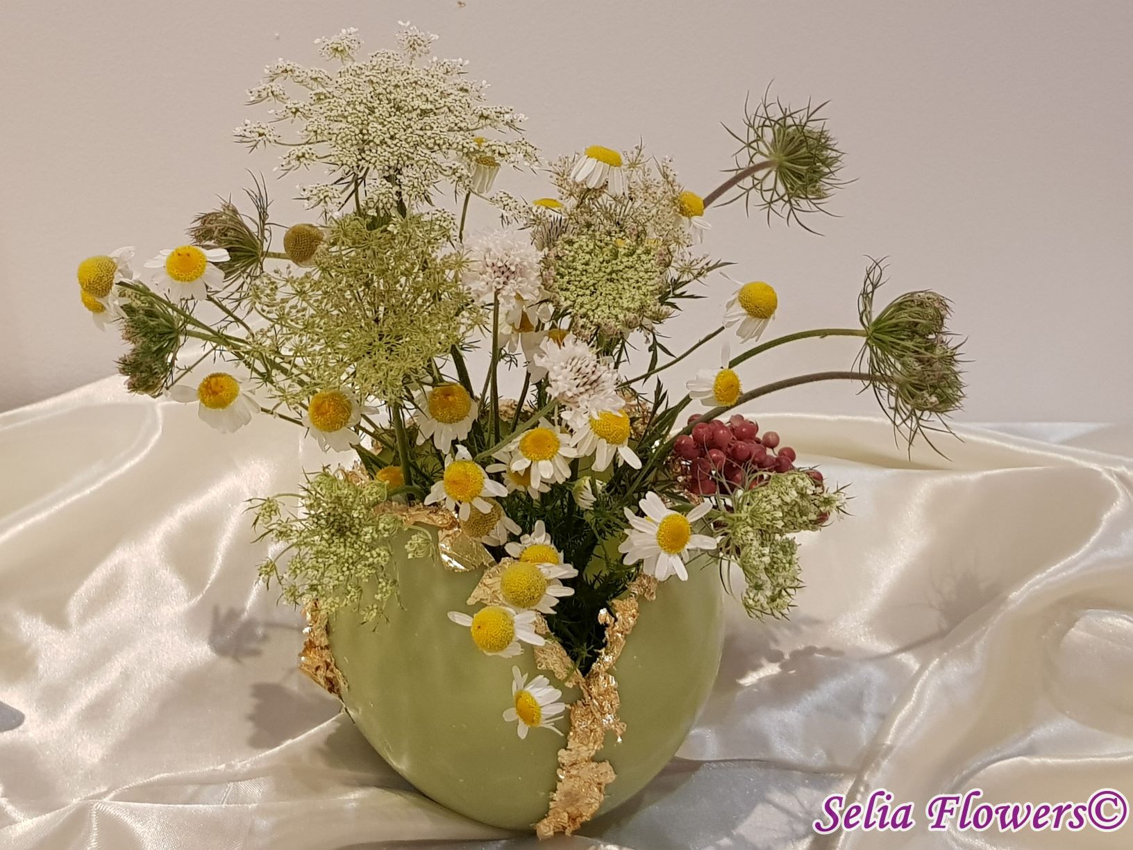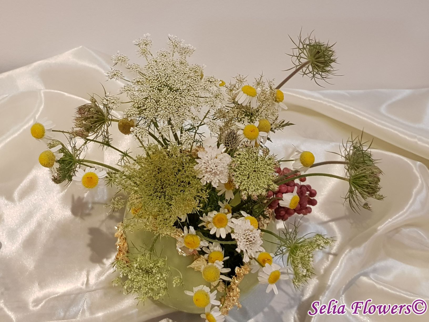 Un vas elegant pentru decorarea mesei, realizat din ceară și prevăzut cu inserție de fulgi din foiță de aur. Vasul este decorat cu flori naturale. Este un produs handmade realizat în atelierul floral Selia Flowers.