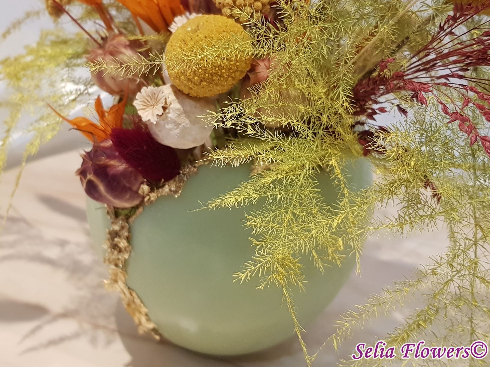 Un vas elegant pentru decorarea mesei, realizat din ceară și prevăzut cu inserție de fulgi din foiță de aur. Vasul este decorat cu flori naturale. Este un produs handmade realizat în atelierul nostru floral.