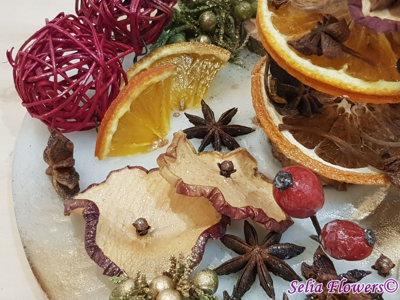 Diametrul aranjamentului este de 25-26 cm si este un produs handmade realizat din ceară in atelierul nostru floral. Este decorat cu bradut construit cu felii de fructe deshidratate (grapefruit, portocala, lamaie, mar), elemente aromatice (scortisoara, anason, cuisoare), crengute de brad, macese si accesorii de sezon.