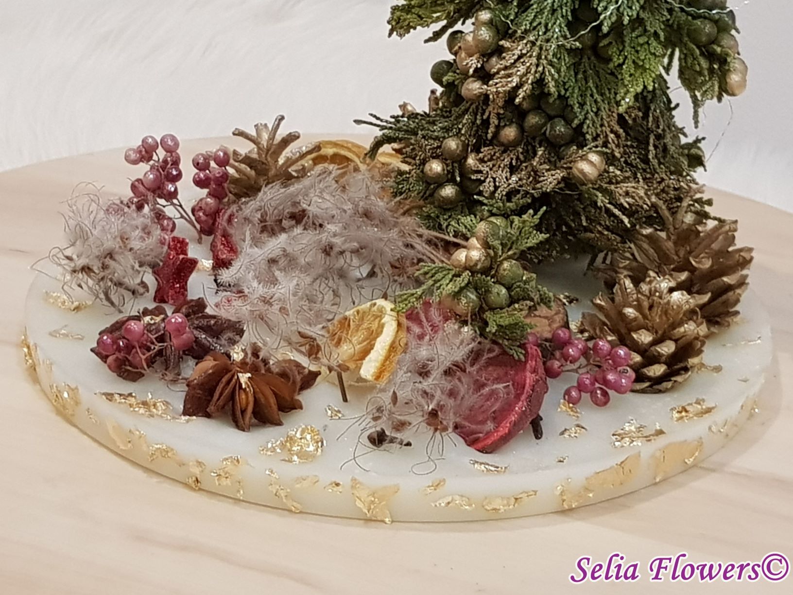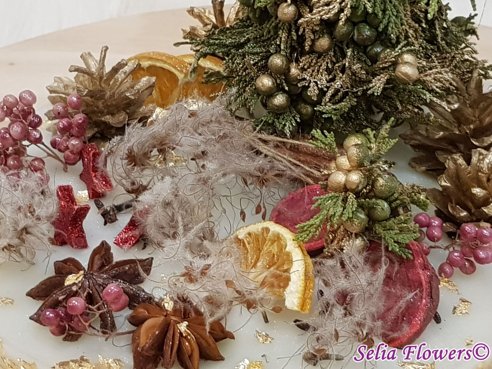 Diametrul aranjamentului este de 25-26 cm si este un produs handmade realizat din ceară in atelierul nostru floral. Este decorat cu bradut construit din crengute de brad natural, felii de portocala deshidratate, elemente aromatice (scortisoara, anason, cuisoare), flori de clematita salbatica, boabe decorative de piper roz, accesorii de sezon si insertii de fulgi din foita de aur care dau aranjamentului un aer de sarbatoare.
