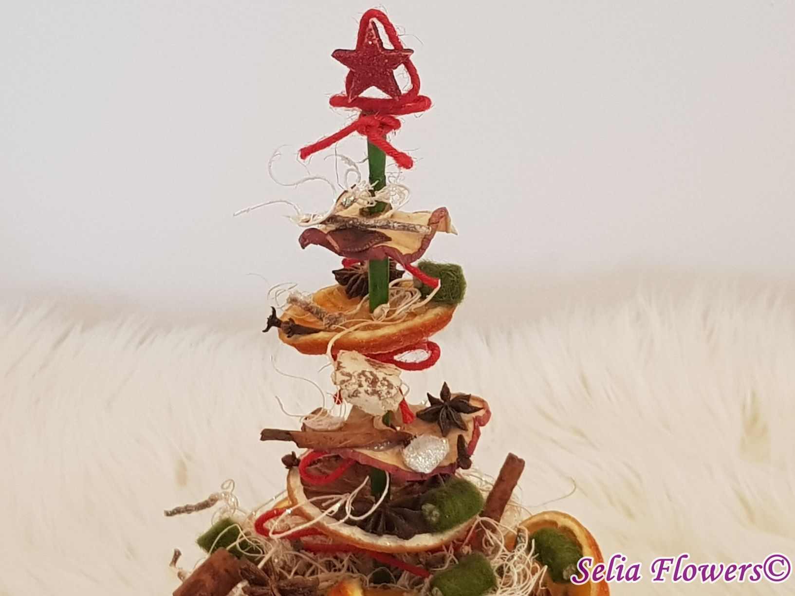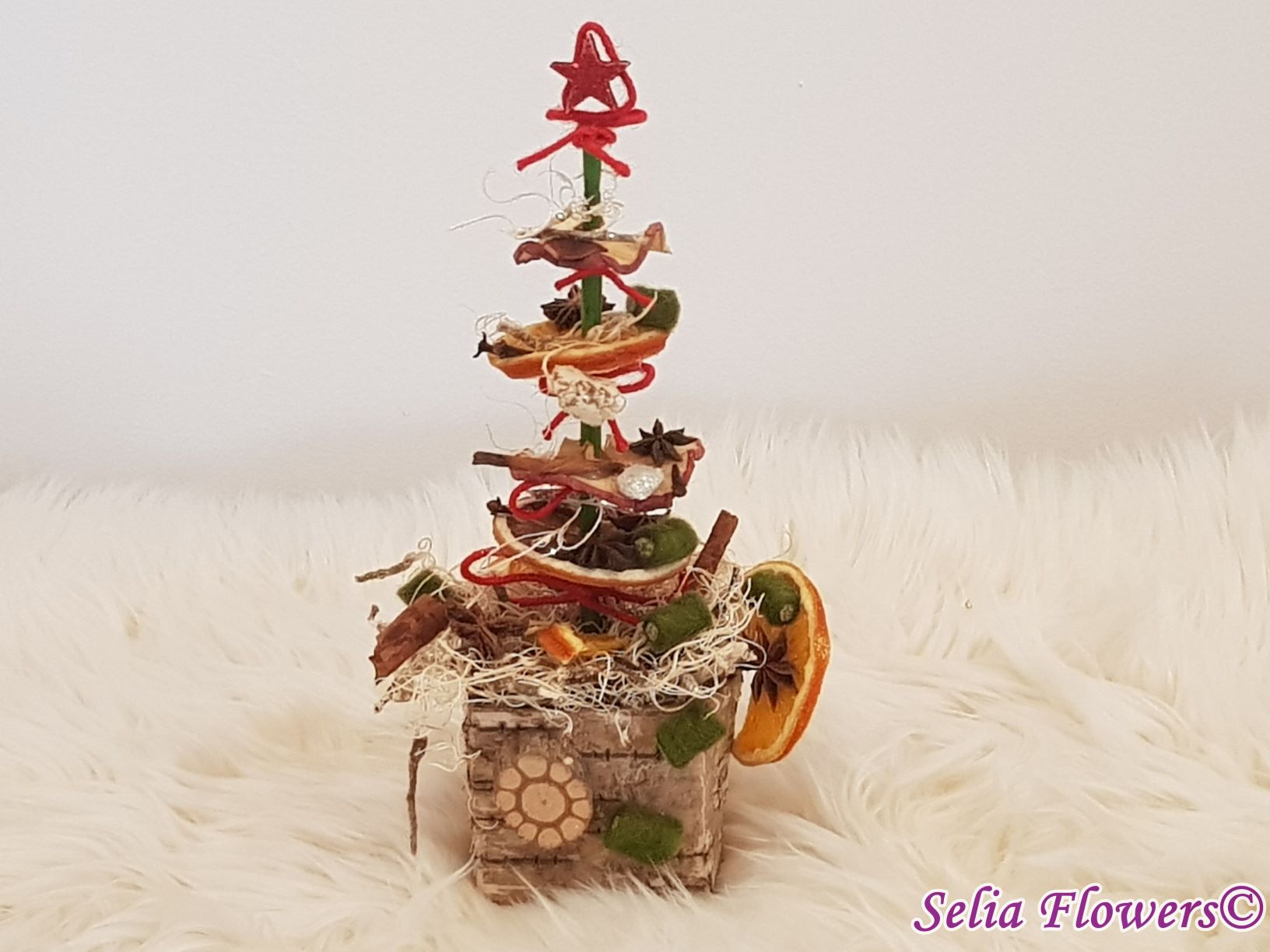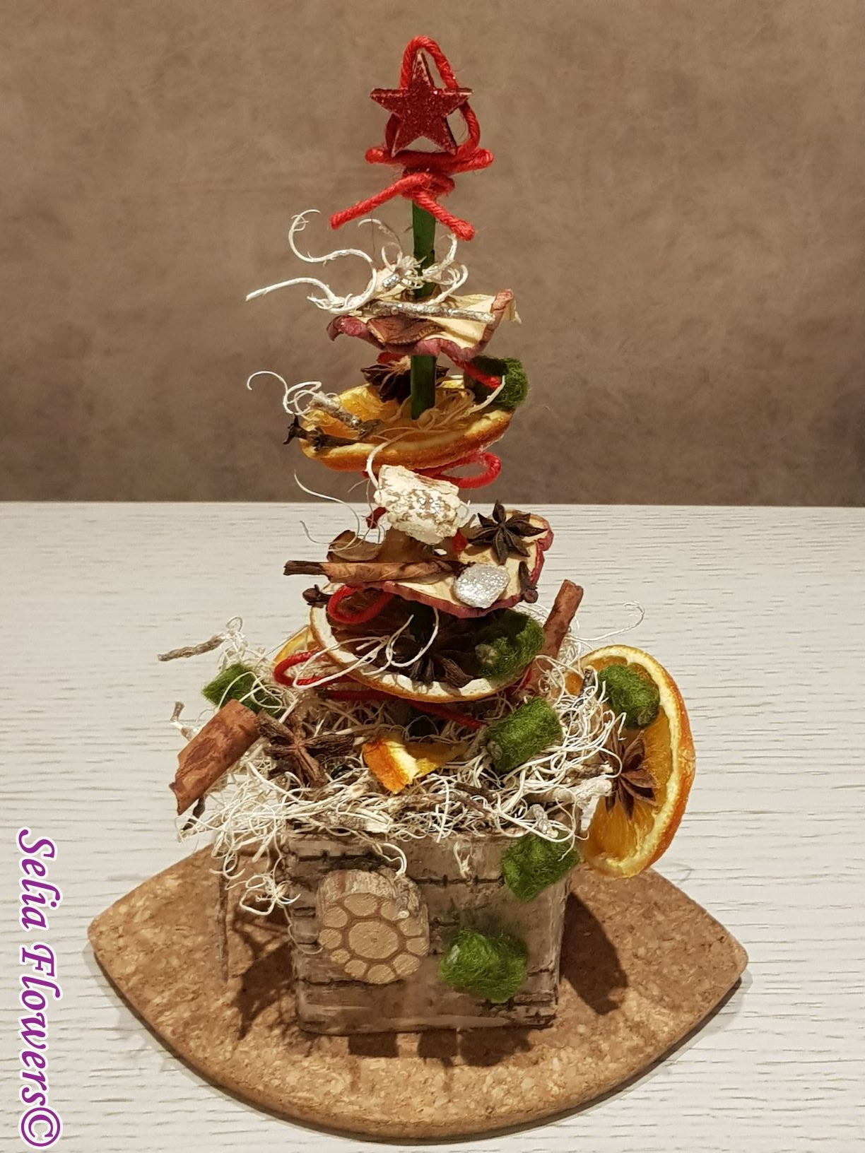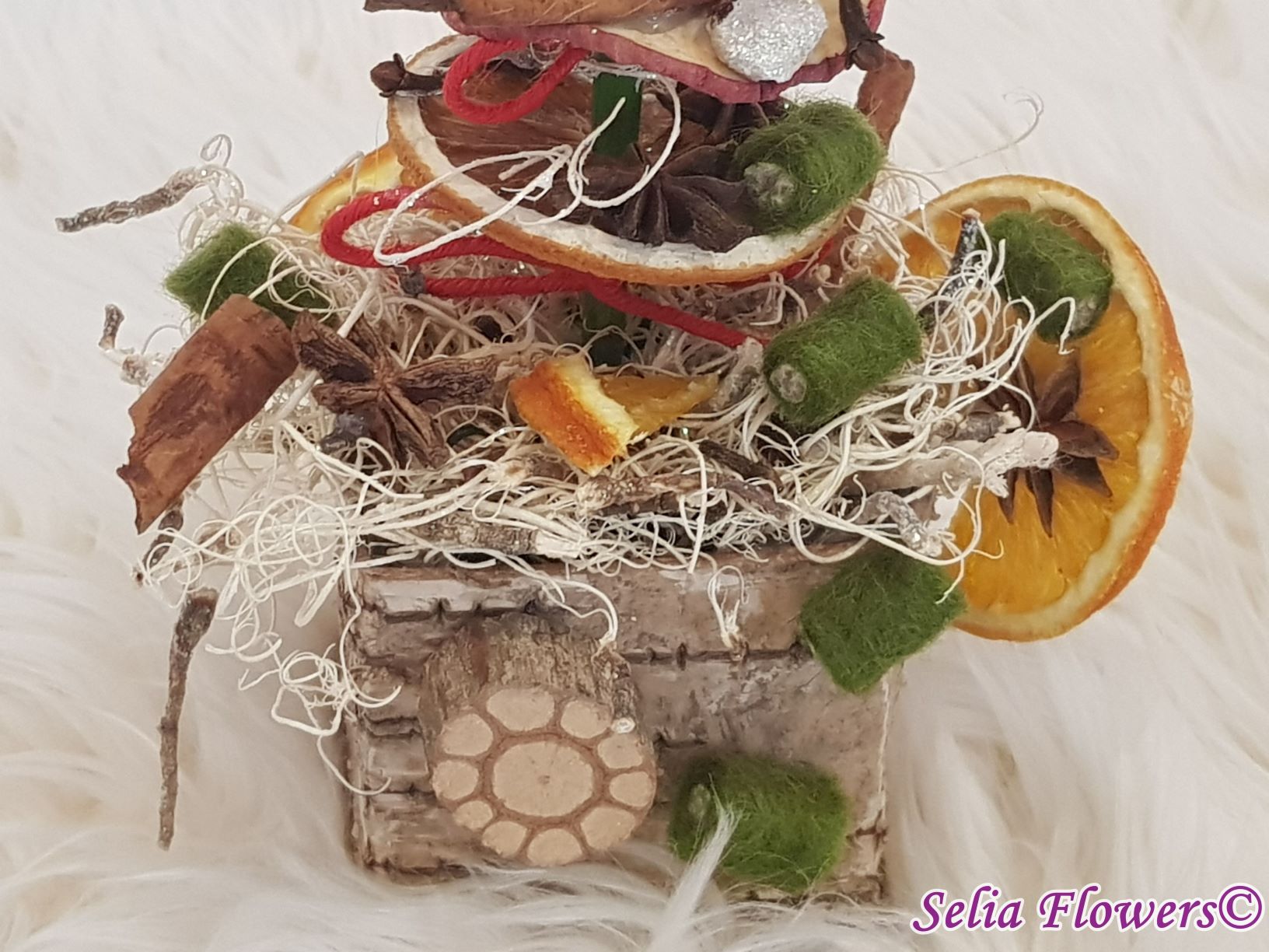 Un bradut cu miresme de Craciun, un aranjament unicat construit in cub de mesteacan cu latura de 7cm, din felii de fructe deshidratate (grapefruit, portocala, lamaie, mar). Este decorat cu elemente decorative aromatice (scortisoara, anason, cuisoare), muschi uscat cret de culoare alba, accesorii din lana. Inaltimea aranjamentului este de 27 cm, din care 20 cm este cea a bradutului construit.