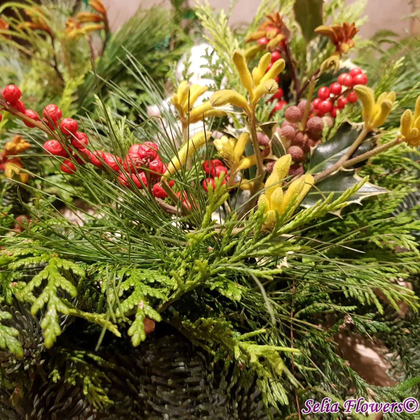 Coronița este construită pe burete floral Oasis, exclusiv din elemente naturale: mix de conifere (brad natural argintiu, tuia și pin), berzelia, ilex , anigozanthos și koralfern. Diametrul coronitei este de 45-48 cm.