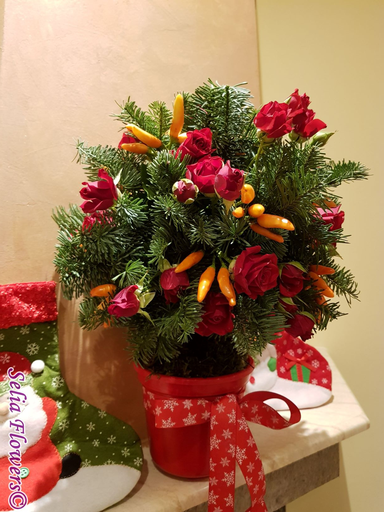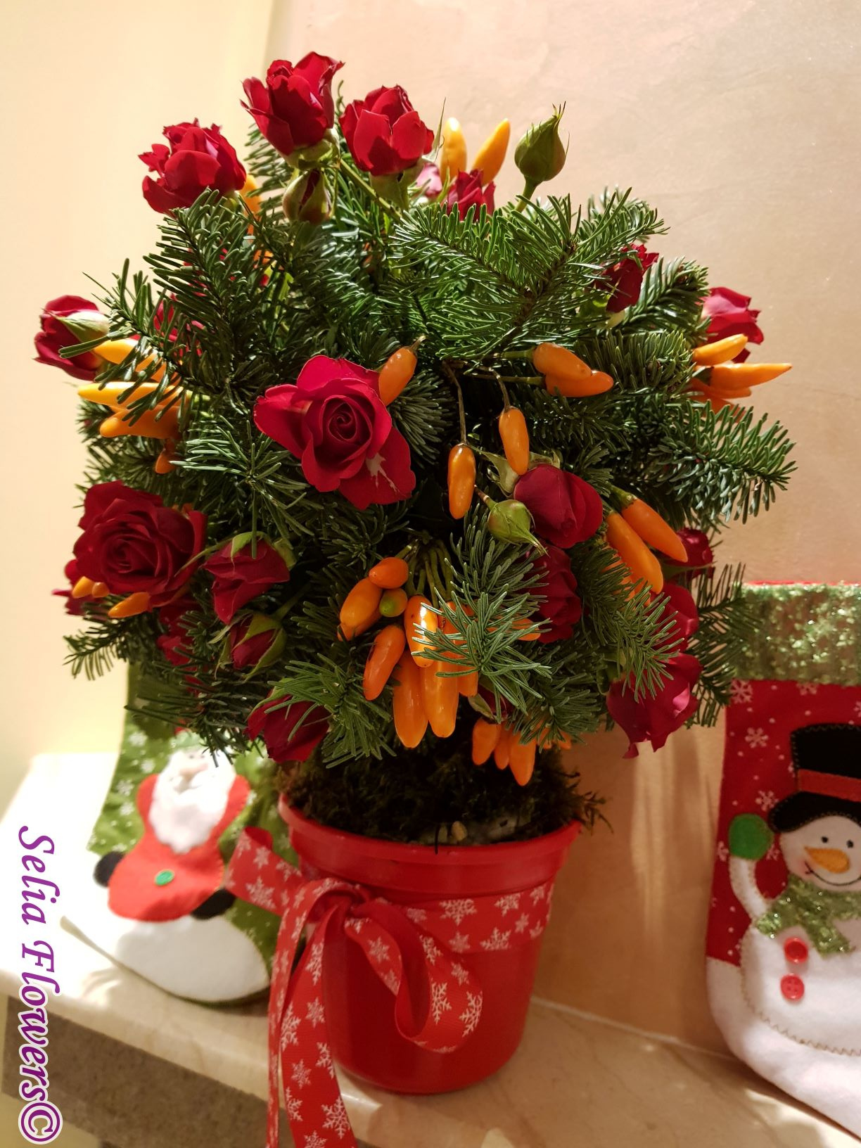 Un brăduț handmade din brad Nobilis, miniroze și ardei decorativ, construit pe suport de burete umed în formă de sferă care asigură hidratarea plantelor.