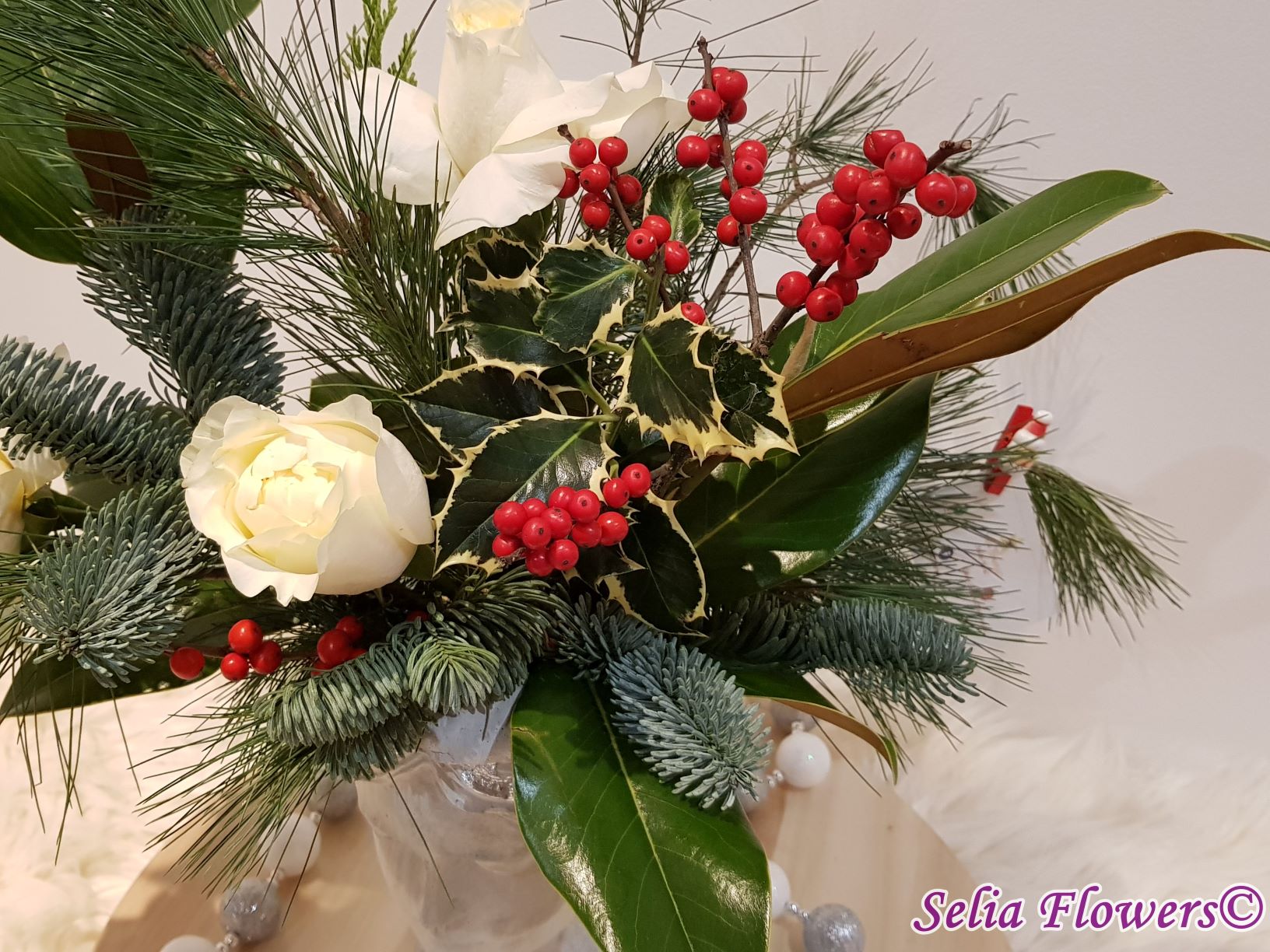 Aranjament în vas Venus, construit în suport de burete umed, cu: trandafiri, crenguțe de ilex, crenguțe de magnolia și mix de conifere.