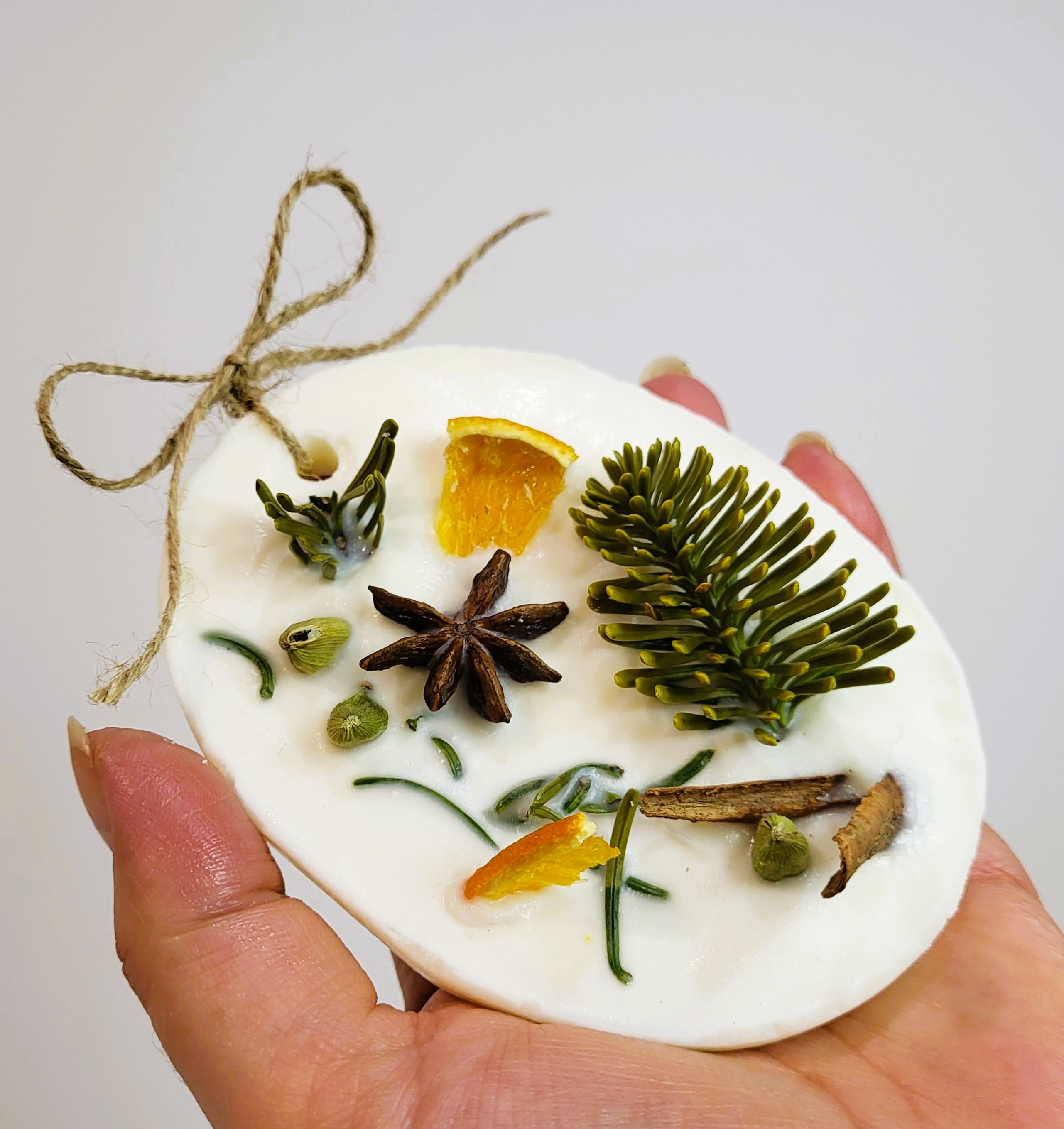 Tableta este turnată manual din ceară de soia de calitate premium. Este parfumată cu uleiuri pure organice de pin, brad, scorțișoară și portocale și este decorată cu crenguțe de brad și mirodenii specifice Sărbătorilor de iarnă (cardamon, scorțișoară, cuișoare, portocală deshidratata). Are o greutate de aproximativ 70 gr.