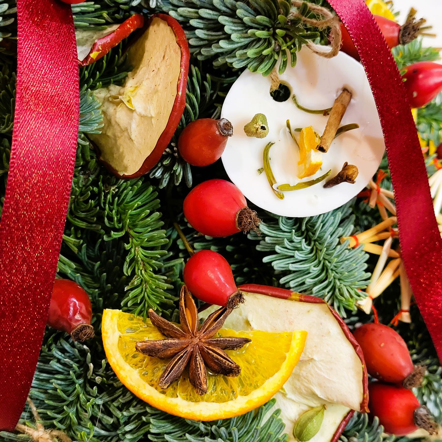 Este accesorizat cu globulețe parfumate din ceară de soia, turnate manual în atelier, elemente decorative aromate – batoane de scorțișoară, felii de fructe deshidratate și anason, precum și alte elemente construite din materiale naturale.