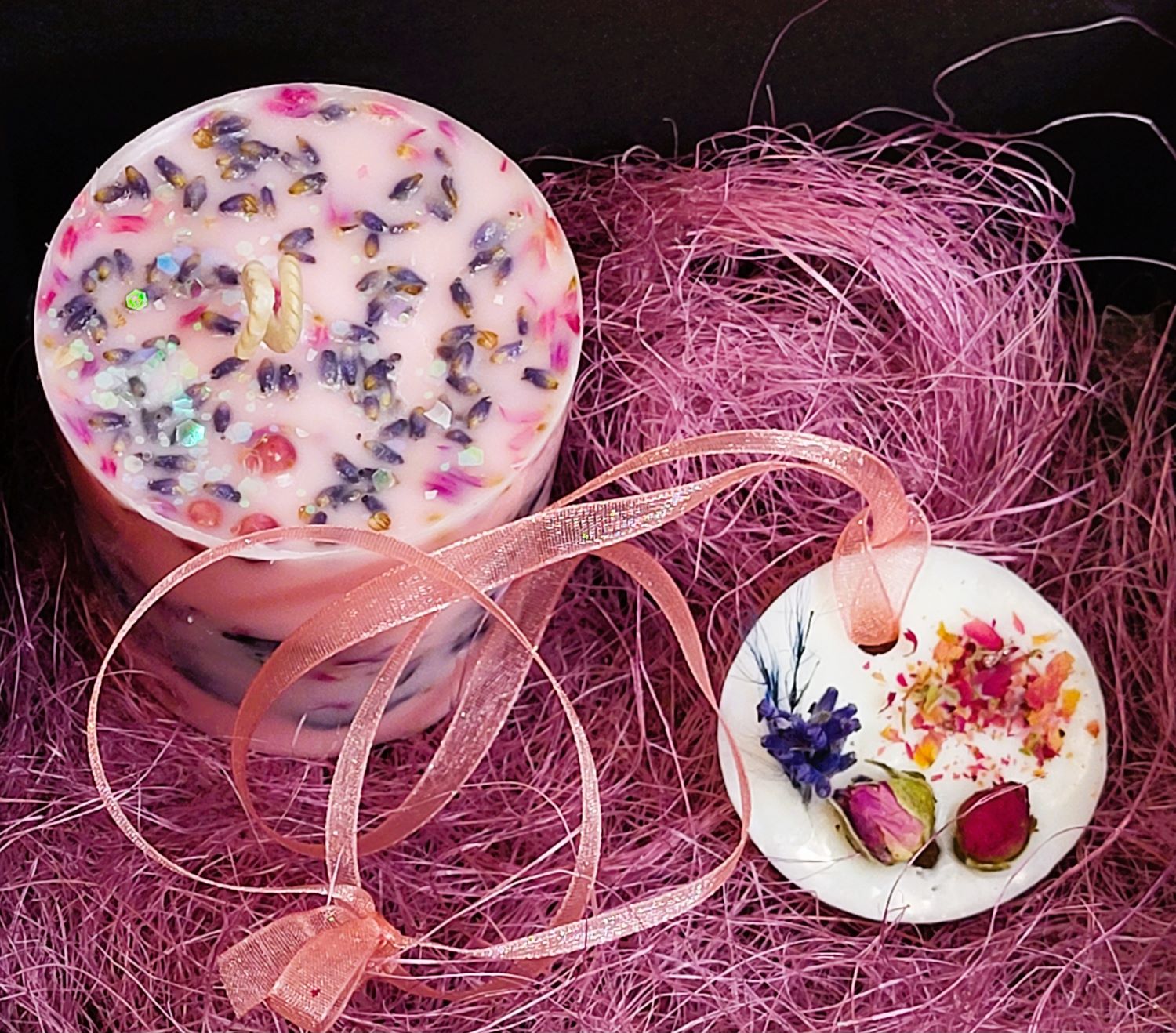 Cutia conține o lumânare handmade din ceară de soia, cu flori de lavandă și hortensie și arome de vanilie și iasomie - greutate, 175 g, precum și o amuletă florală parfumată - greutate, 19-11 g.