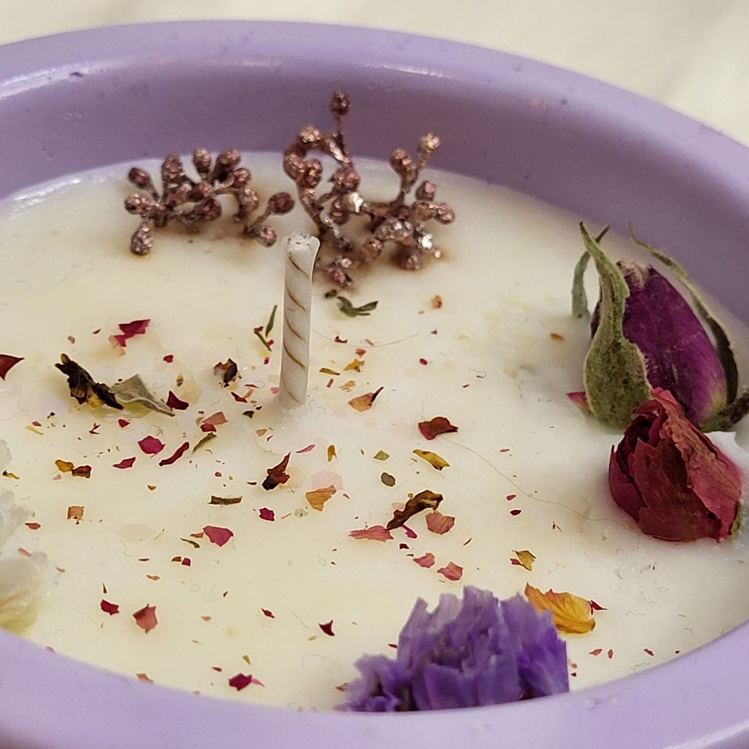 Lumânare parfumată handmade din ceară de soia, turnată în recipient ceramic de culoare lila. Este decorată cu boboci și petale mărunțite de trandafir și flori uscate. Este îmbogățită cu arome de Velvet Rose&Yasmine, Roasted Coffee și Spring floral. Greutate, 150 g.
