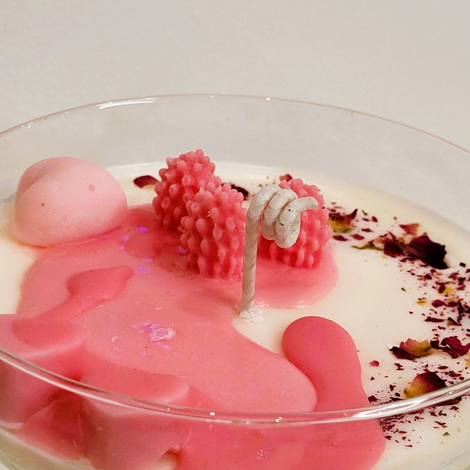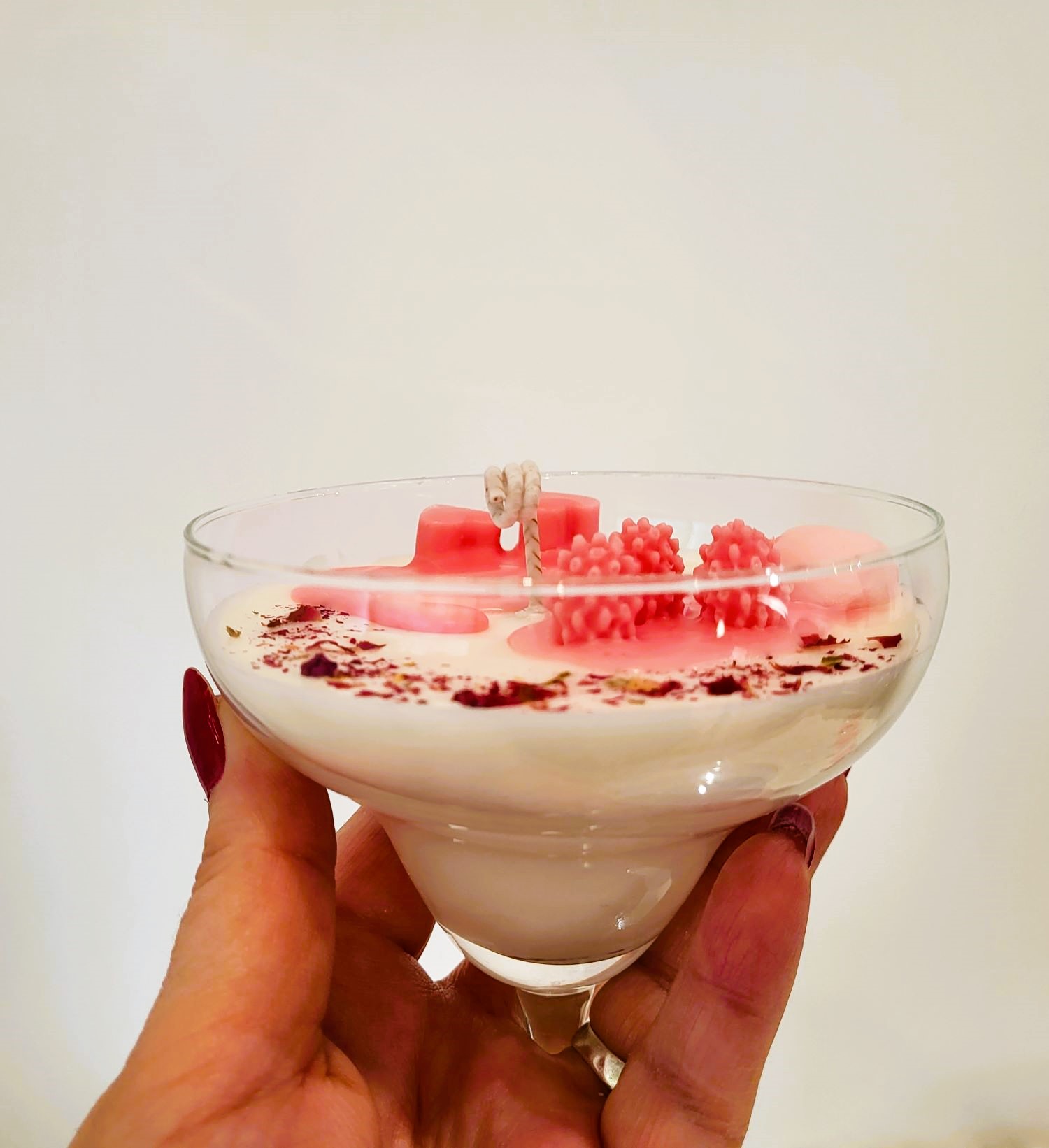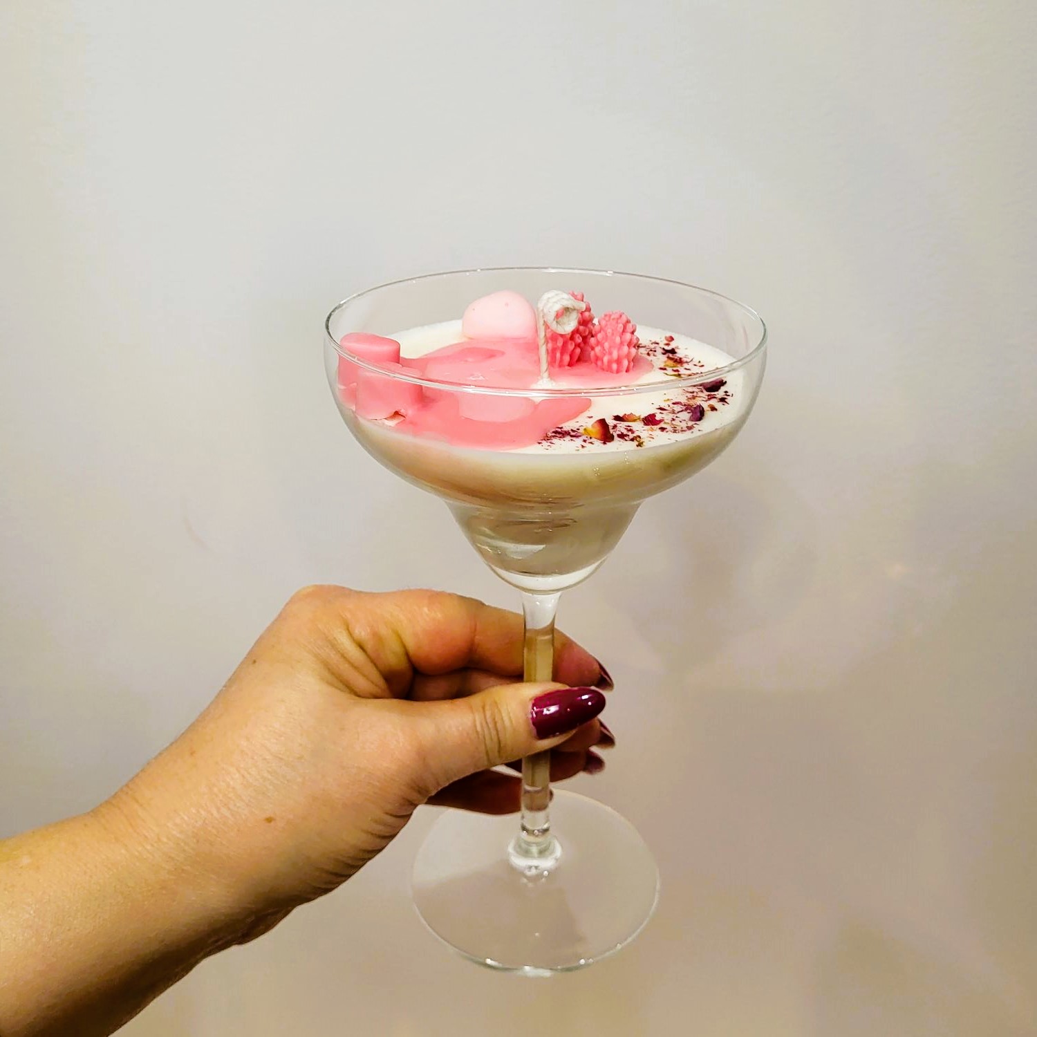 Pentru o persoană specială, un dar pe măsură! O cupă de șampanie; roz, cu multe inimioare, petale de trandafir și frăguțe. Alături de mix-ul de arome - Velvet Rose&Yasmine, Roasted Coffee și Spring floral – devine o experiență de neuitat. Greutate, 285 g.