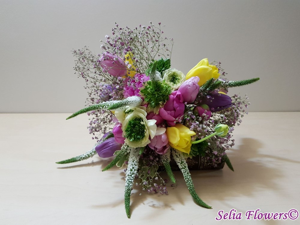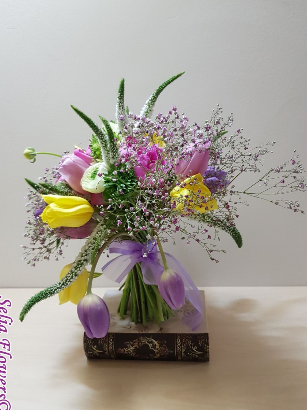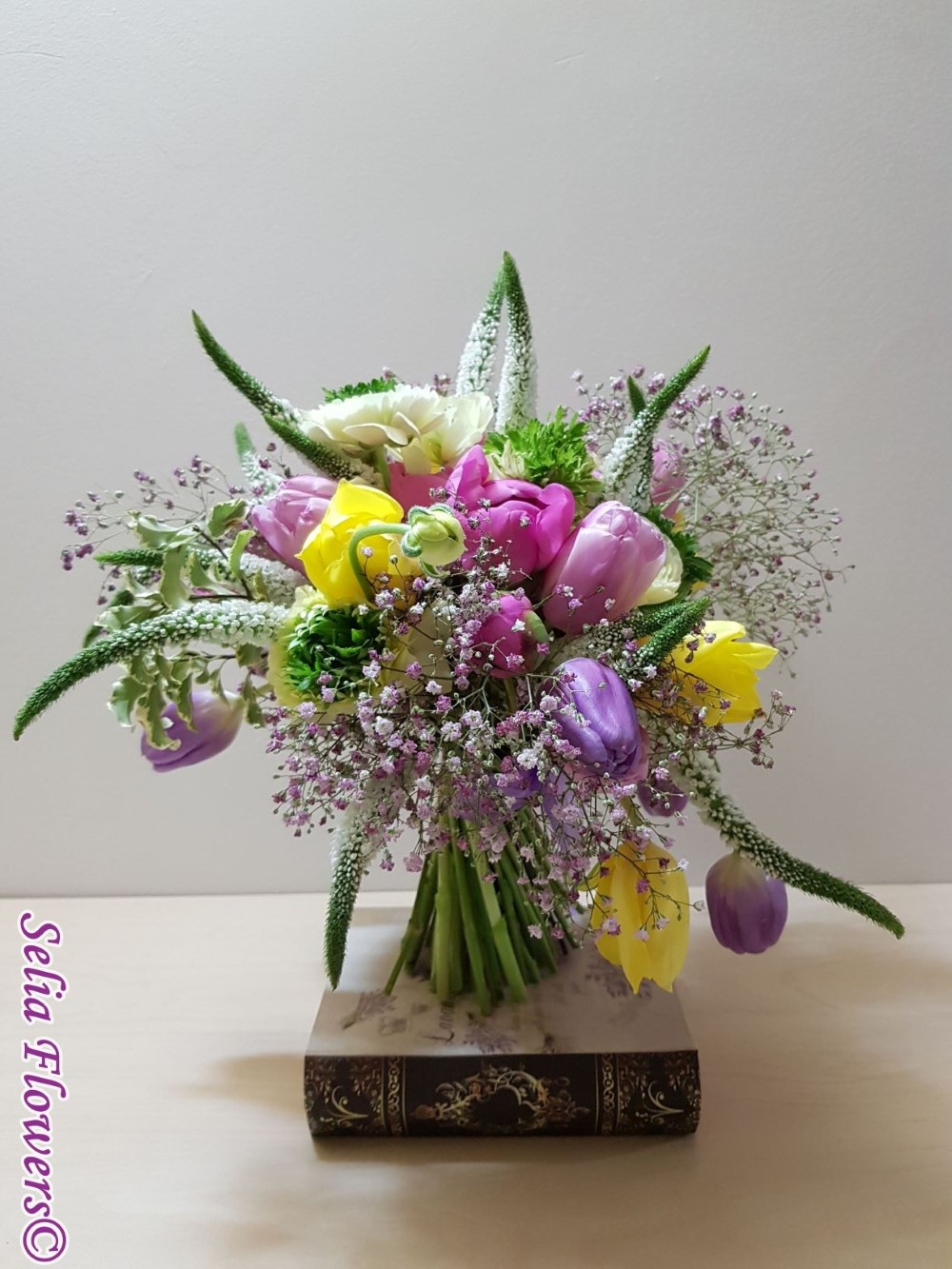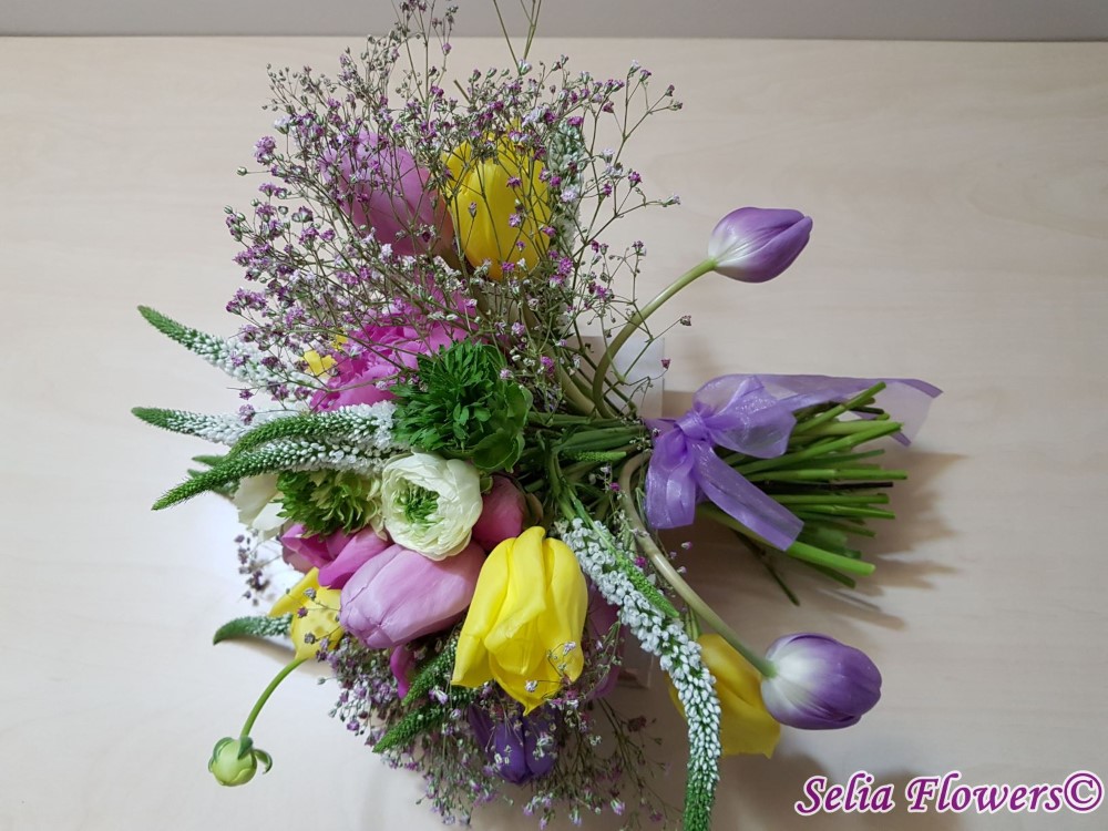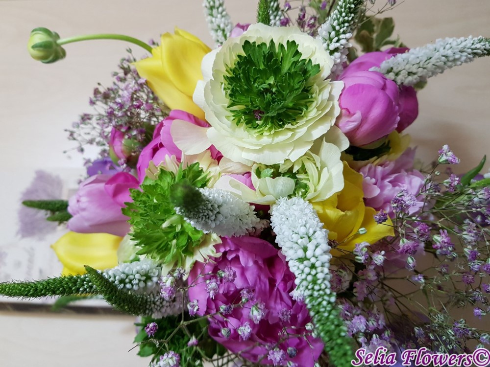 Buchet realizat din lalele, veronica, ranunculus, bujori, gypsophilla roz si accesorii.
