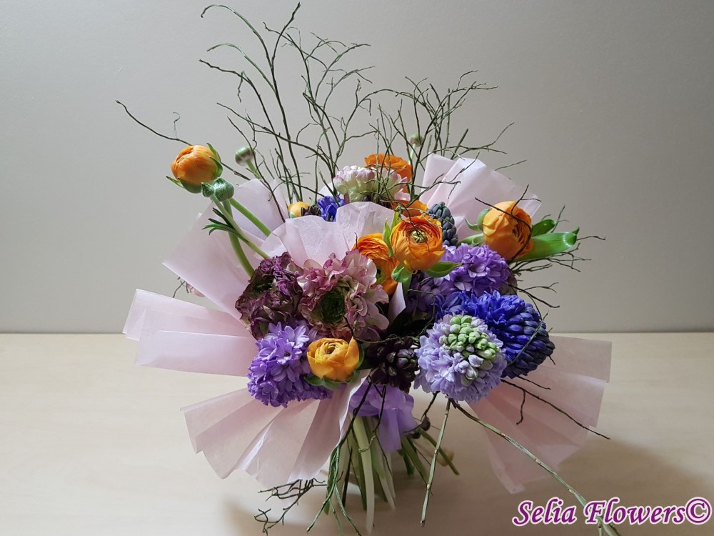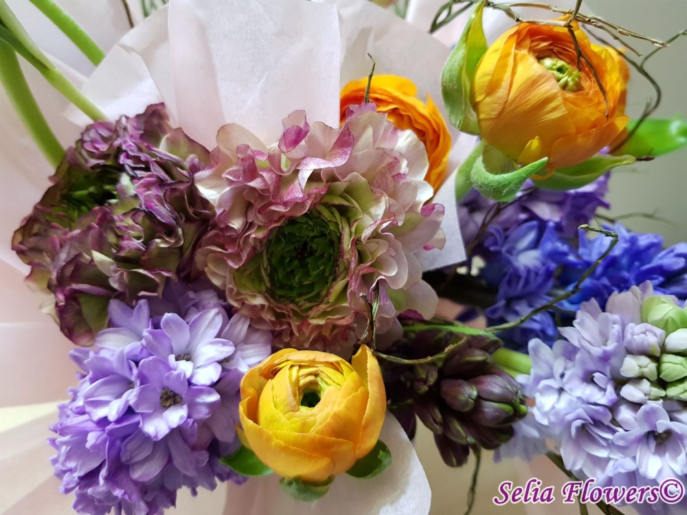 Primavara autentica: un buchet construit cu 9 zambile, 16 fire de ranunculus, heidelbeer, accesorizat cu hartie din matase.