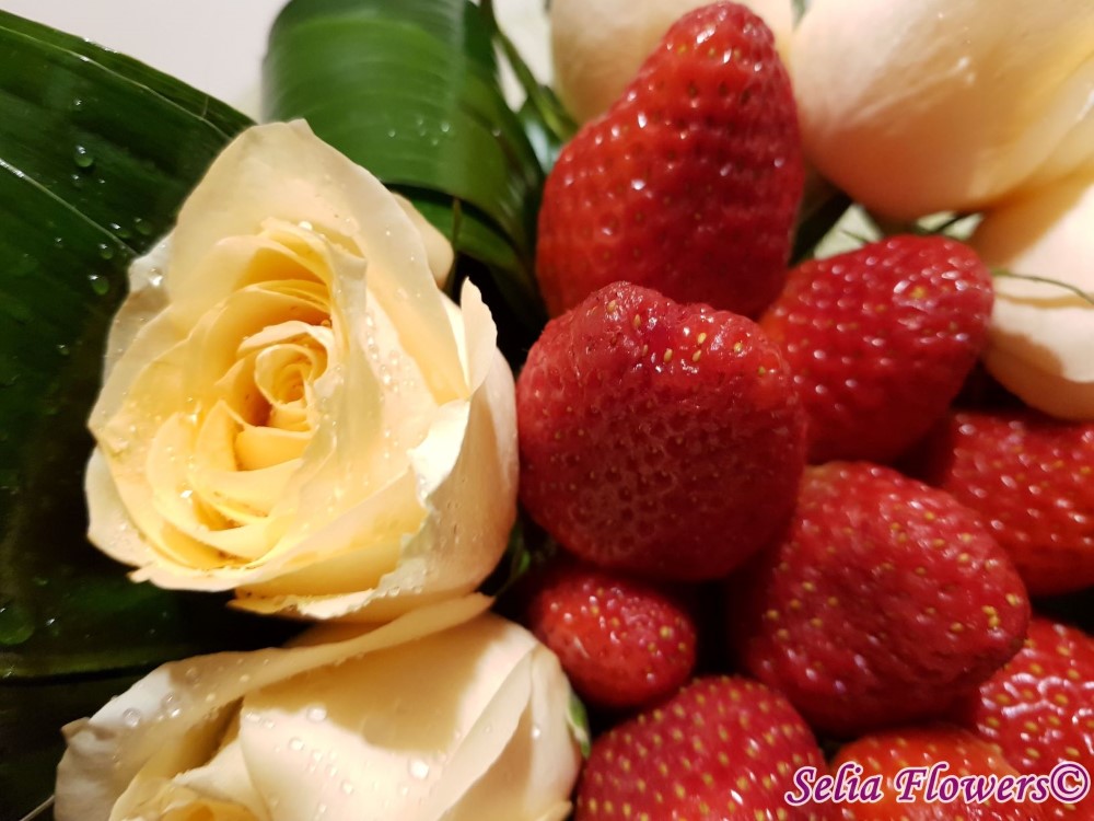Daca vrei sa o surprinzi si sa o si rasfeti in acelasi timp, ai gasit buchetul perfect, realizat din 9 trandafiri, capsuni proaspete, aspidistra si accesorii.