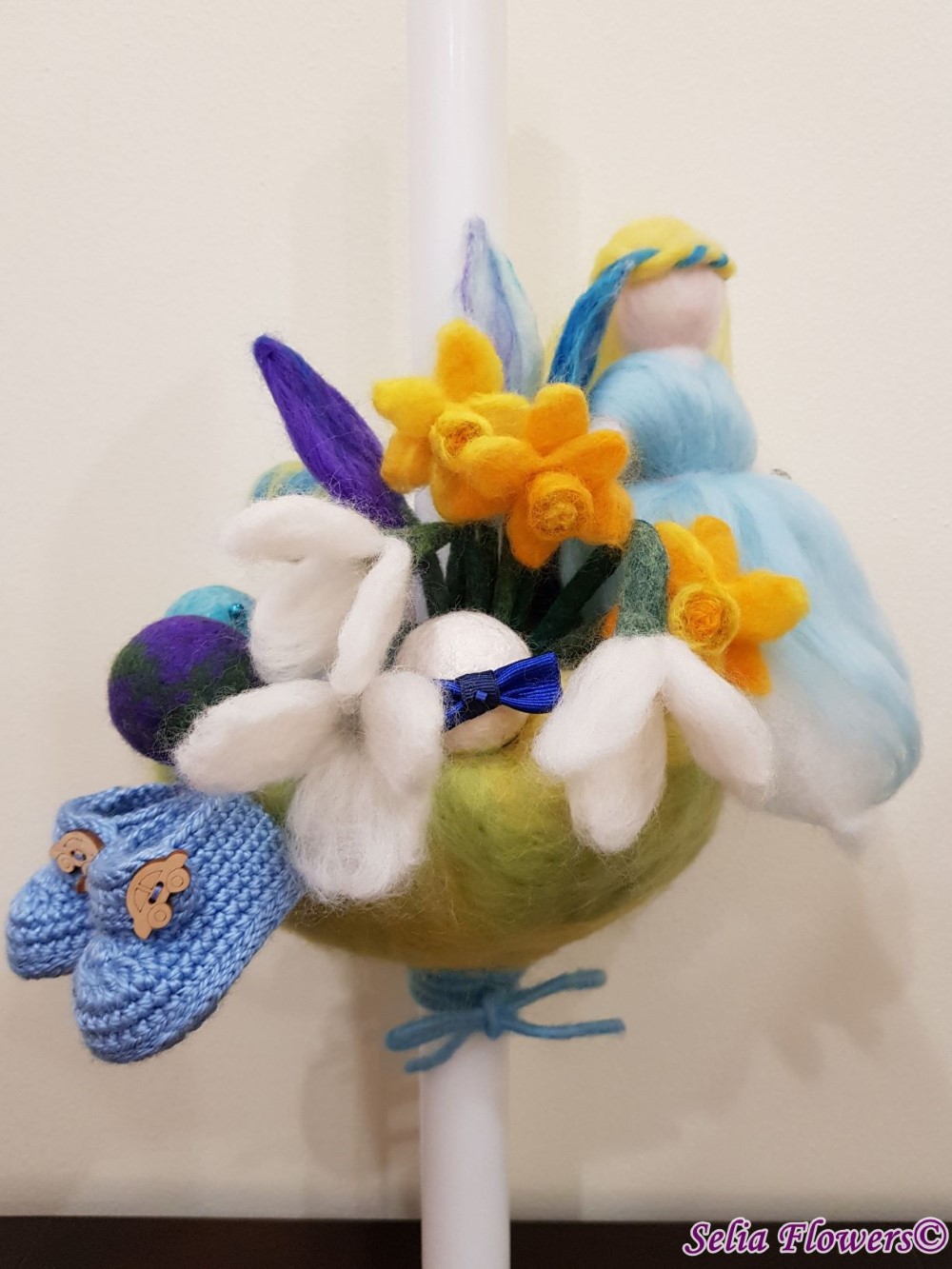 Lumanare de botez pentru baietel, realizata handmade pe semisfera imbracata cu lana, cu flori si ghemulete de lana, ghemulete si botosei din material acril si zana din lana.