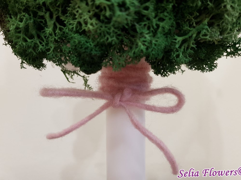 Lumanare de botez pentru fetita, realizata handmade pe semisfera imbracata cu licheni stabilizati, cu flori si ghemulete de lana, ghemulete si botosei din material acril si zana din lana.