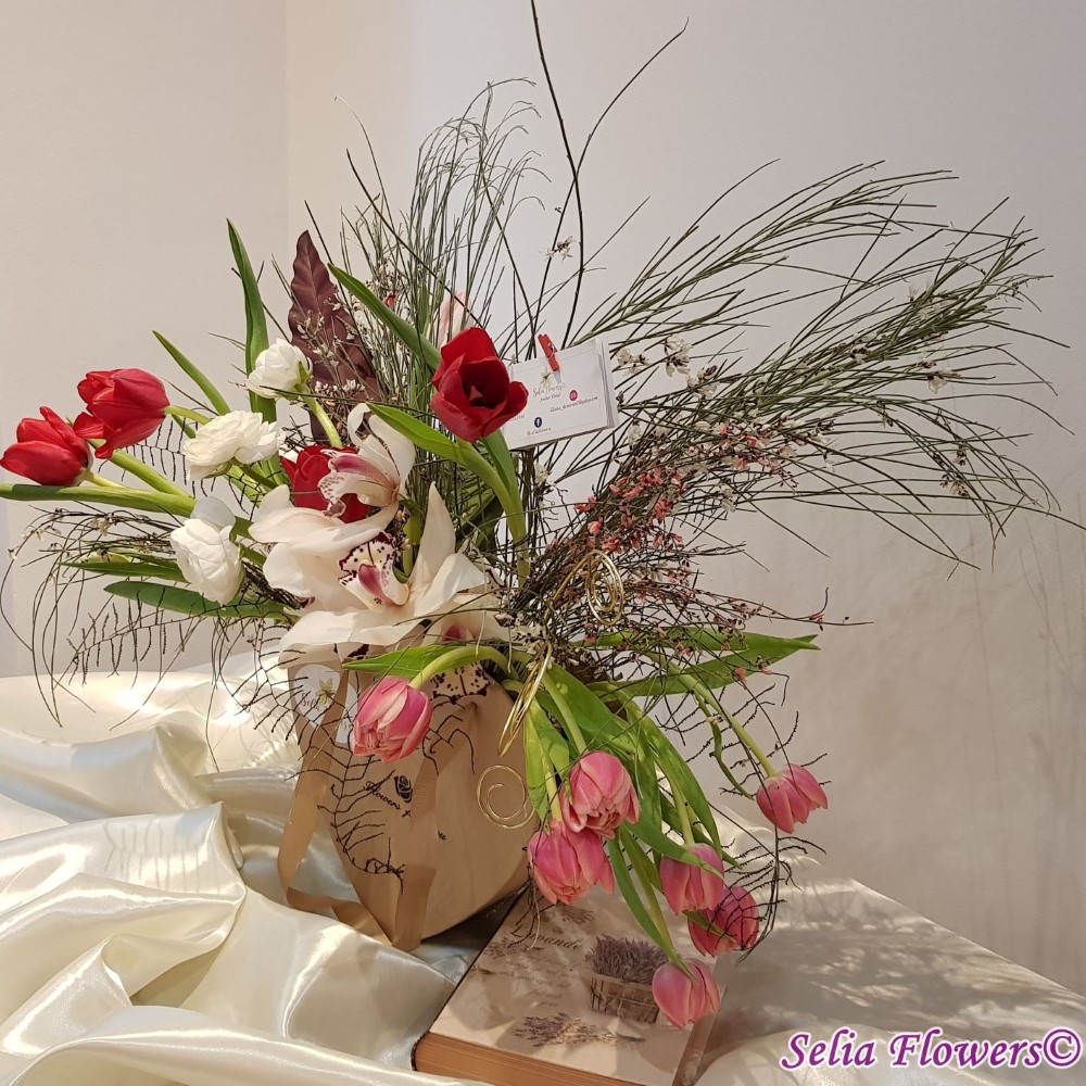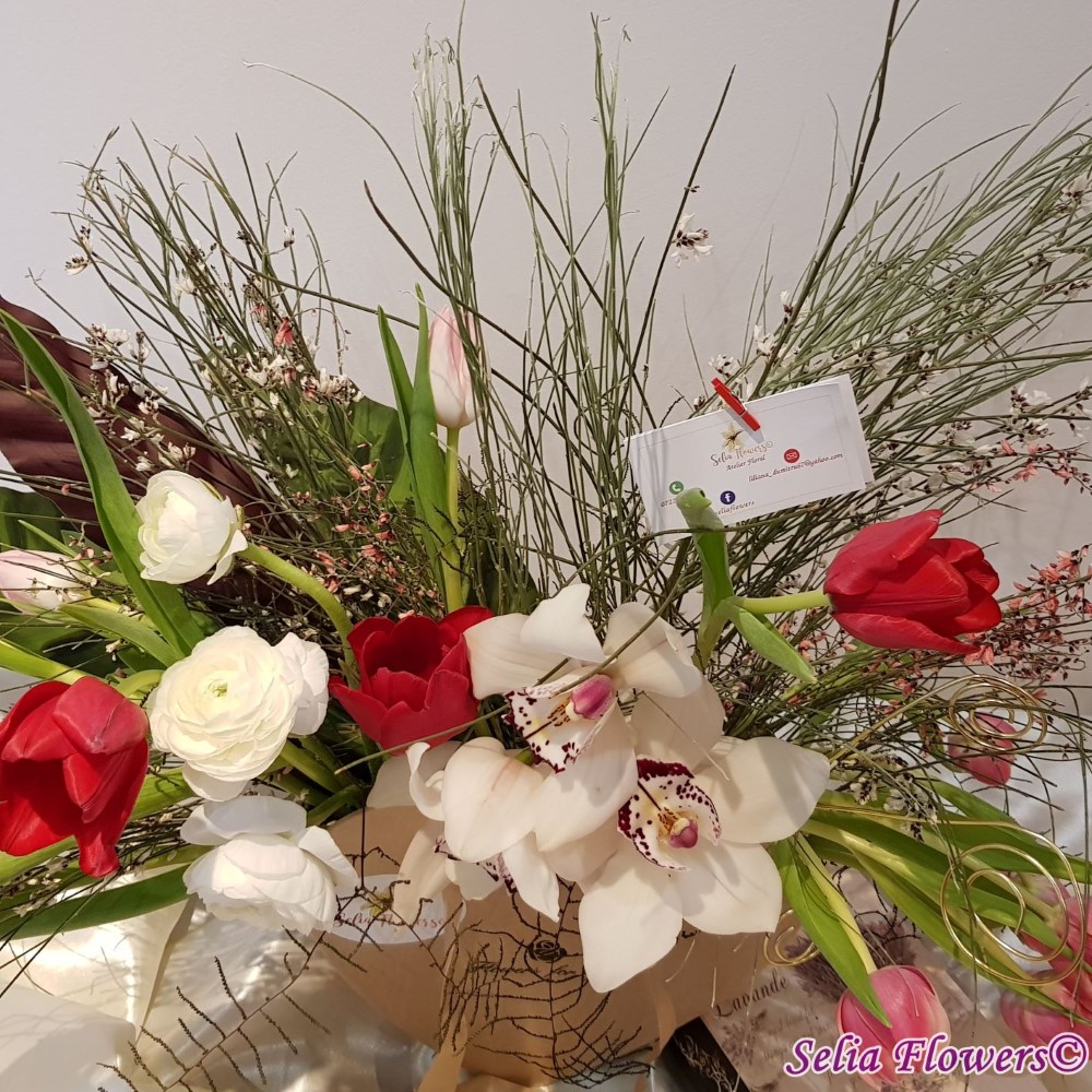 Compozitie: orhidee cymbidium, lalele in doua culori, ranunculus, ginster in 2 culori, verdeata, accesorii din sarma floristica.