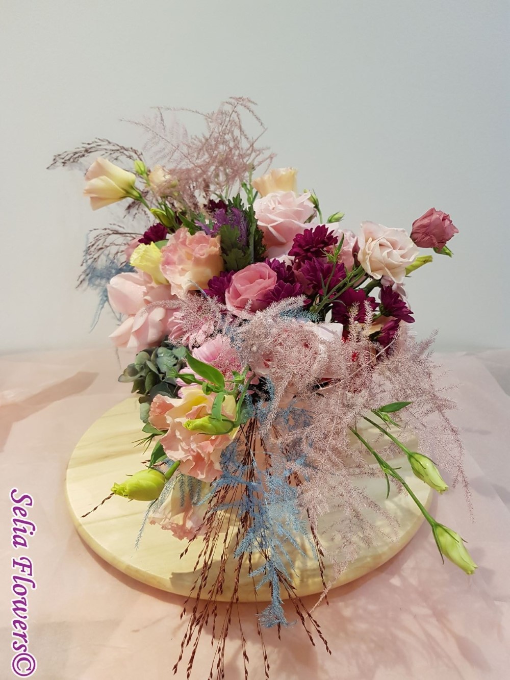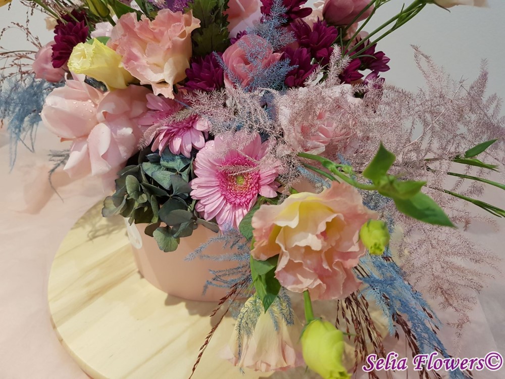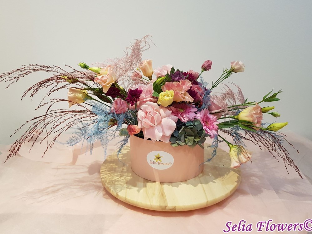 Aranjament in cutie, construit in suport de burete umed, cu trandafiri, lisianthus, germini, minicrizantema, asparagus, panicum vopsit, hydrangea uscata, brassica.