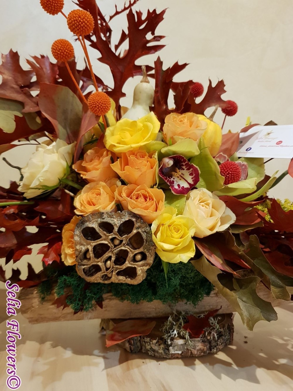 Compozitie: trandafiri, cupe de orhidee cymbidium, craspedia vopsita, eucalypt vopsit, germinis, flori de protea, frunze de artar, muschi si licheni stabilizati.