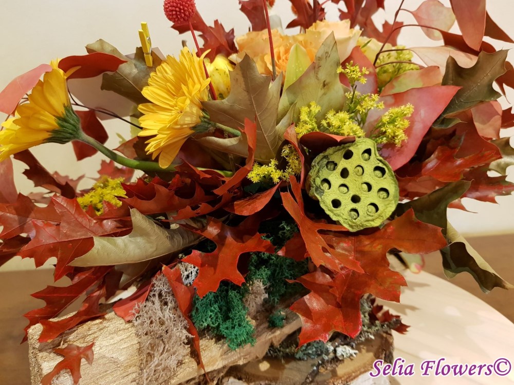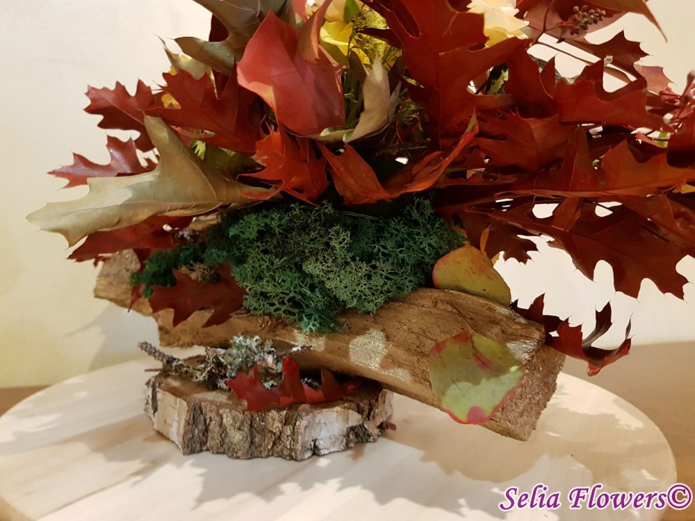 Decor de toamna rustic realizat pe bustean si felie de lemn.